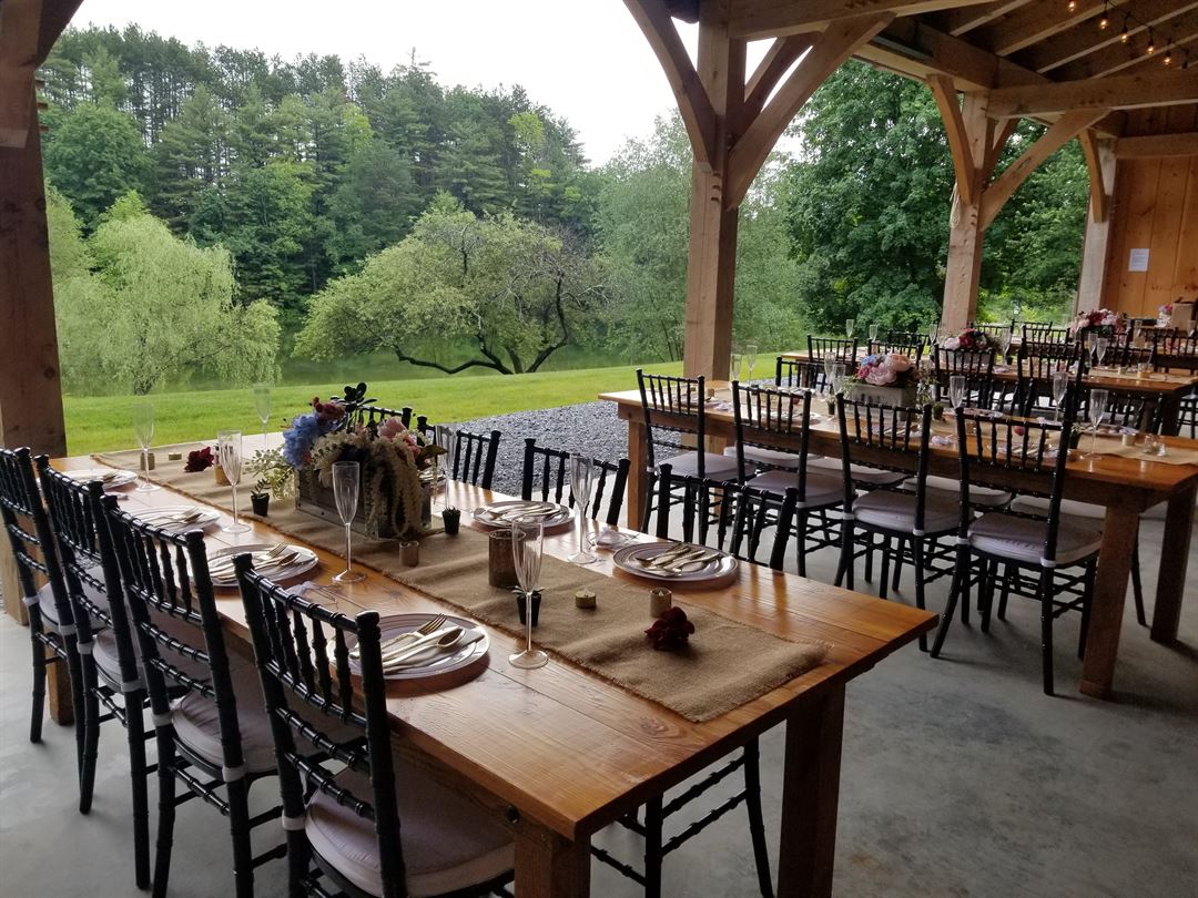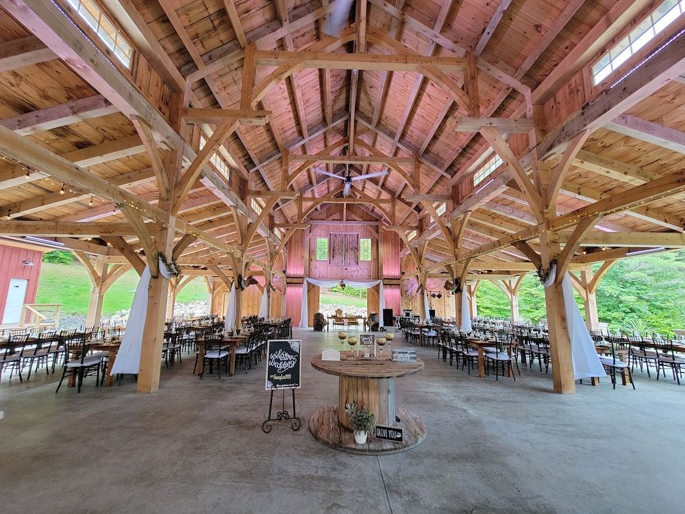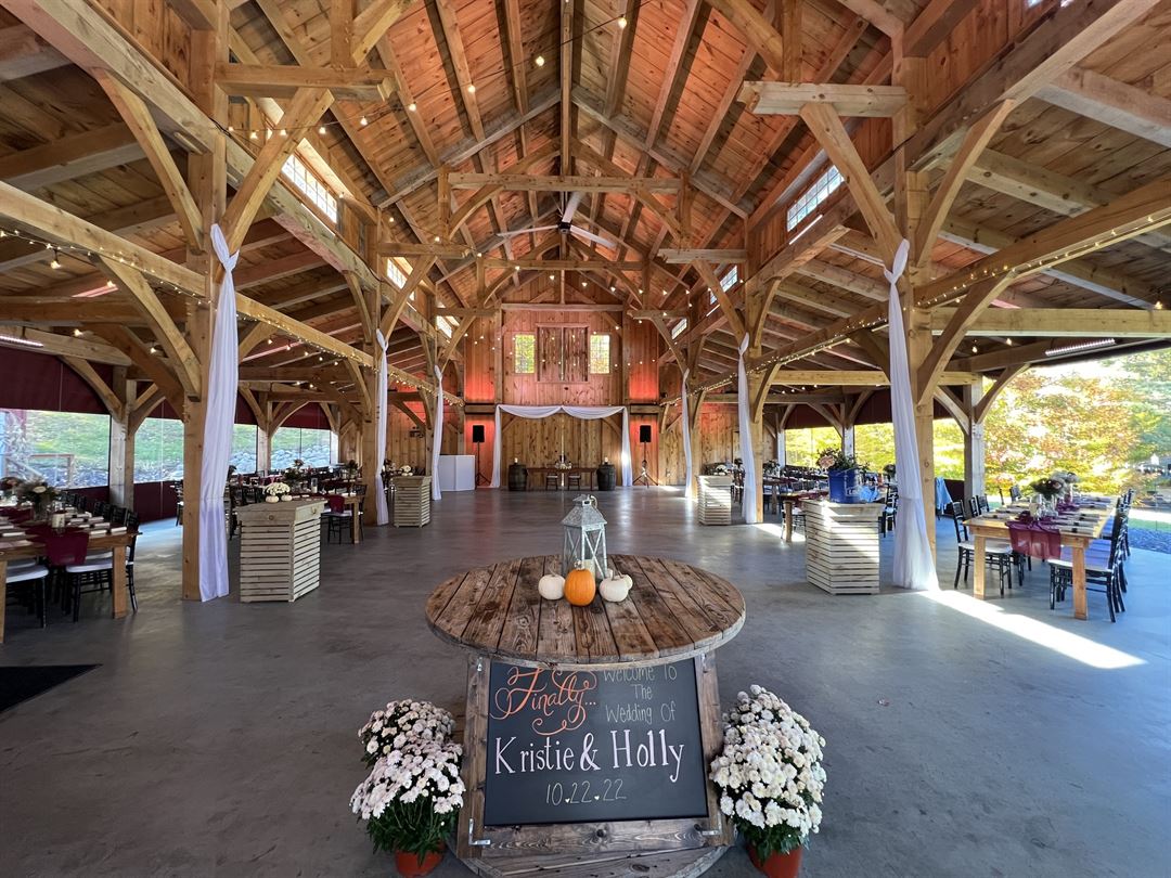 Beautiful timber frame barn wedding venue just 15 minutes from downtown Saratoga Springs, NY. Commercial grade canvas sides with windows roll up for nice weather and can be quickly closed if needed. On-site lodging available at Rustic Barn Campground. Get in touch to schedule a tour.