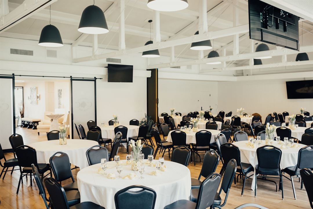 The Corvallis Club wedding venue space includes an expansive outdoor terrace with five covered, moveable pavilions, festival string lighting and mobile bars for up to 250 guests. The connected indoor ballroom space offers a perfect rainy-day option with seating for up to 120 guests, clean white walls, exposed beams, fun pendant lighting and full audio/visual built-in system. The ceremony space sits in between the outdoor terrace and the 10th fairway with views of the course and Mary’s Peak on a clear day.