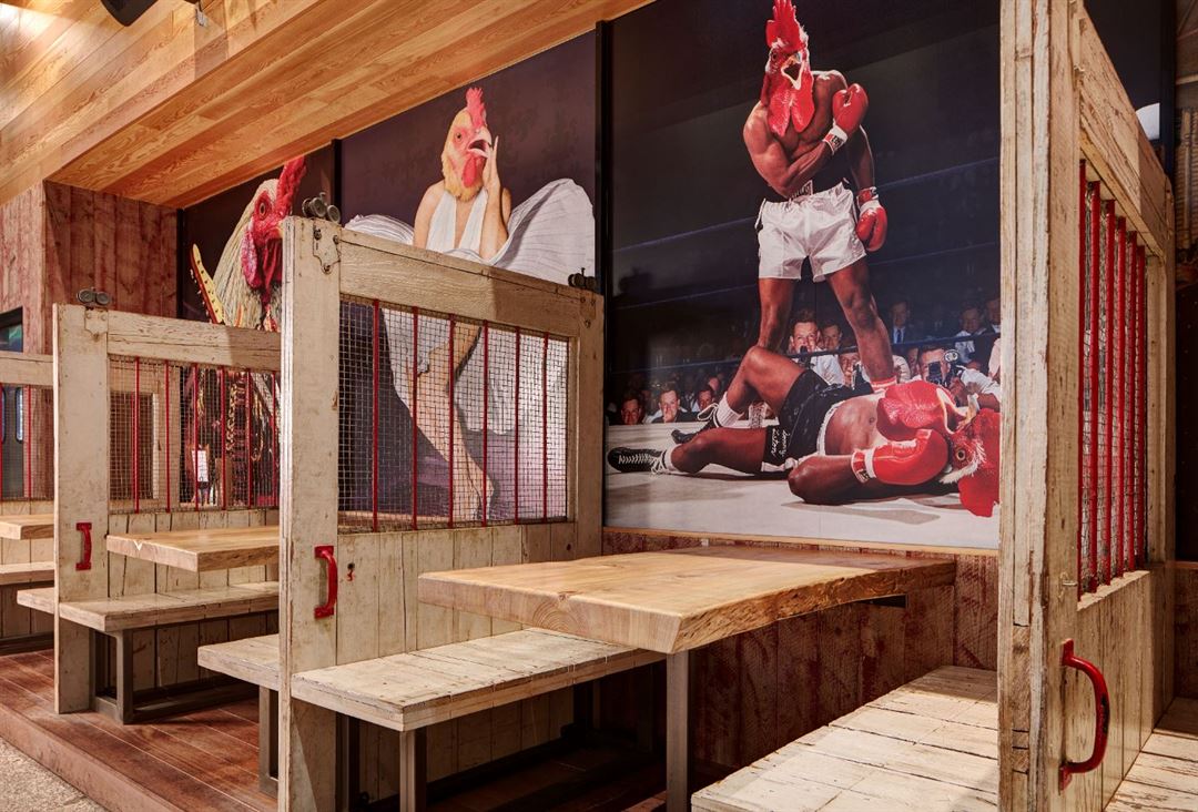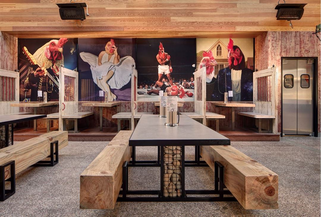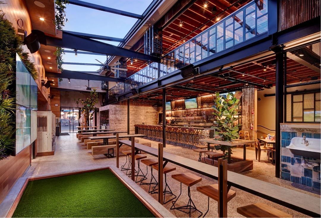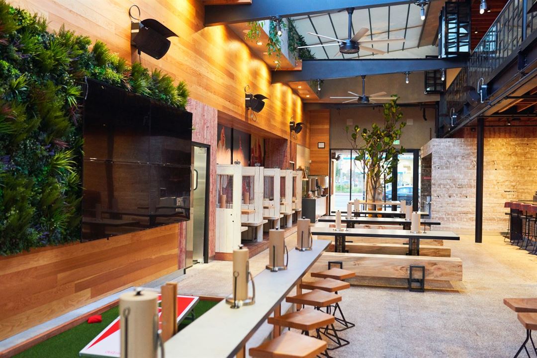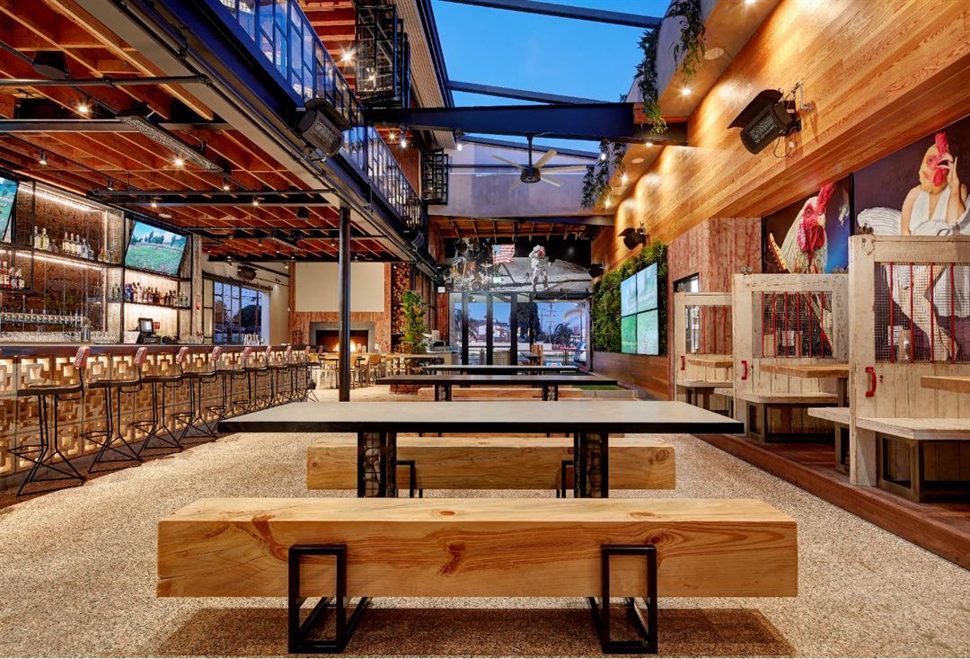 Once a chase bank, this Crack Shack space is located on East 17th, in a hipster enclave in the heart of family-friendly Costa Mesa. The two-story restaurant brings the outside in with a retractable roof to flood the old bank with natural light and add an “al fresco” feel. The open second story overlooks the main dining area below, which creates a seamless flow for large celebrations, or can be blocked off as a semi-private space for more intimate gatherings. A small outdoor patio space adjacent to the main dining room allows for overflow, more games, cocktail tables, photo opportunities and more. The space also features a full bar, corn hole “court”, indoor fireplace, and several large communal tables. It’s truly an idyllic gathering space for guests young and old.