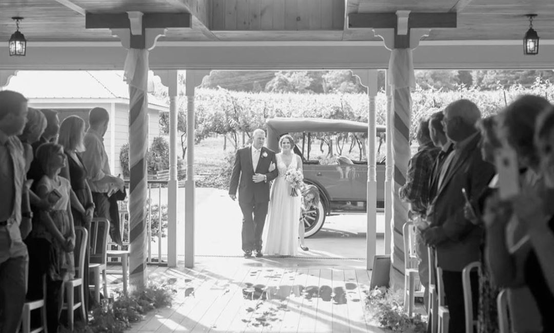 Frogtown Cellars is a Southern Styled architectural gem nestled in the heart of “The Dahlonega Plateau”, located just one hour and fifteen minutes outside of Atlanta, Ga. Imagine your wedding ceremony surrounded by the panorama of 42 acres of rolling vineyards backed by glorious mountain views. You make your entrance driven down the winding road to our Lake Side Pavilion amidst the vines in our 1924 Studebaker or 1933 Desoto Coupe. Your reception takes place in our elegant architectural stone encased old-world timber frame facility seating over 200 guests. Covered and open decks enhance the ambiance, offering outstanding views of the vineyards and mountains to your guests.