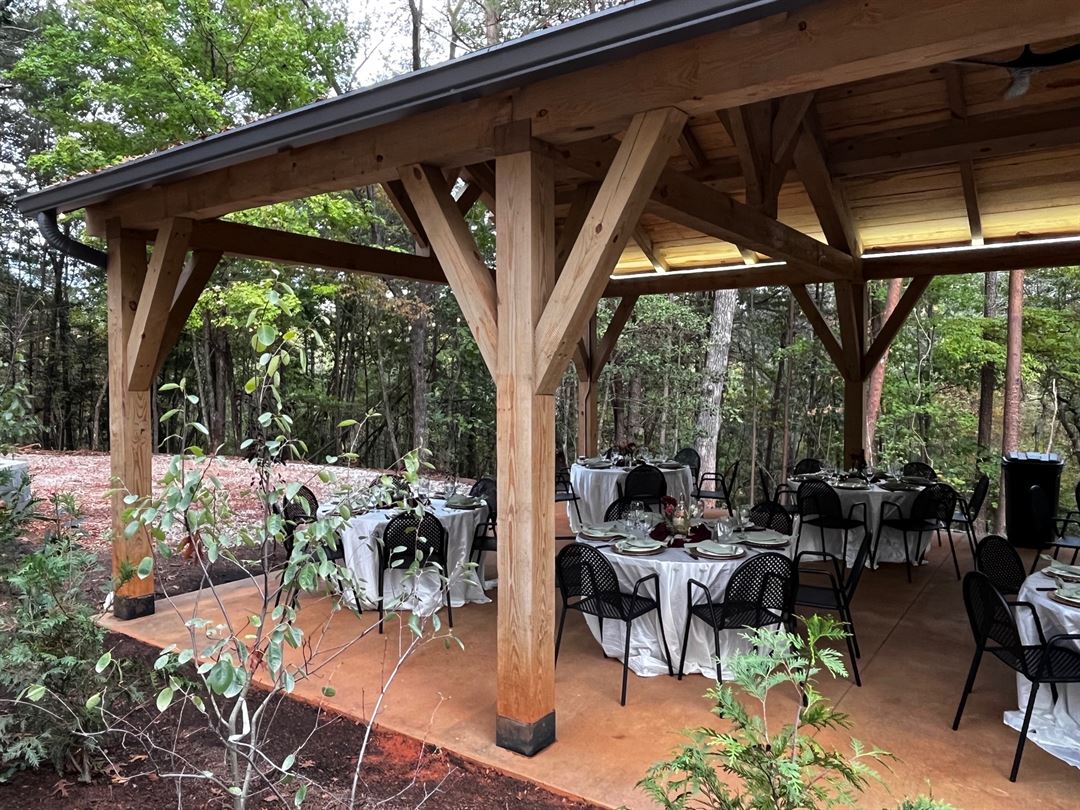 Completed in summer of 2024, The Pavilion at The Limelight Inn is perfect for gatherings of +/- 50 guests (rehearsal dinners, micro weddings, family gatherings, etc). It is tucked back in the woods on our property, so it offers privacy in the woods of the North Georgia Mountains. The Pavilion is equipped with tables, chairs, refrigeration, serving space, a sink for your use, bathrooms and parking for approximately 15-20 vehicles. It also has retractable sides to protect from wind and precipitation so, rain or shine, your event will be stress-free. We also have a robust list of qualified vendors to help pull it all together.