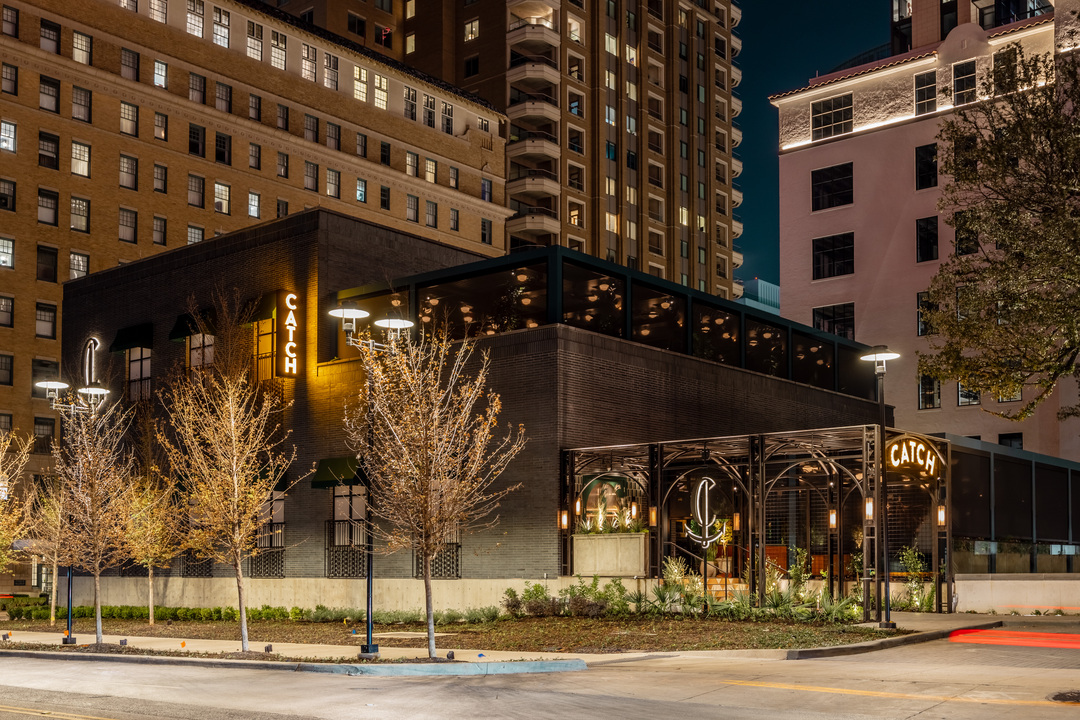 Located in Uptown Dallas' historic Maple Terrace, Catch Dallas offers versatile indoor and outdoor spaces across two levels. The crown jewel of Catch Dallas is the Emerald Room, a sophisticated private dining space featuring a luxurious copper-detailed bar and rich green lacquer accents. The Emerald Room seamlessly extends to our second floor terrace, offering a transformative outdoor experience with a retractable roof, striped canopy, and teal trellis.
