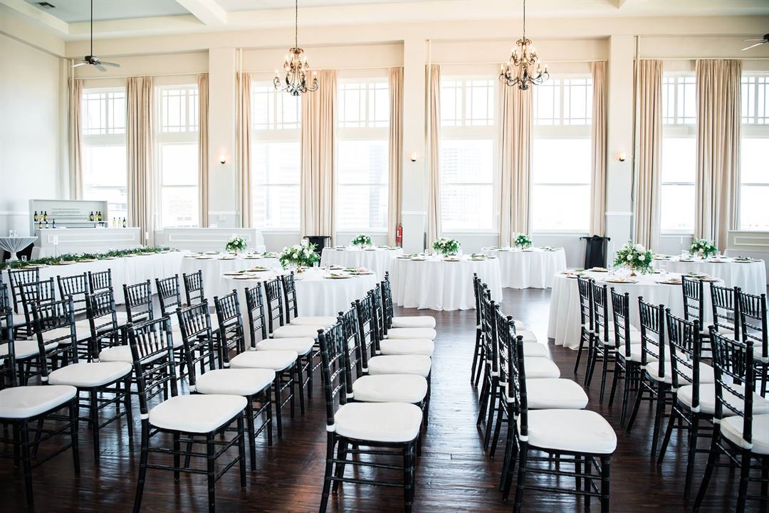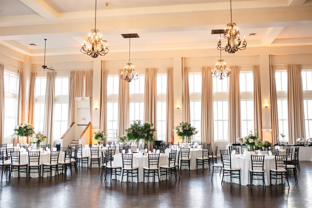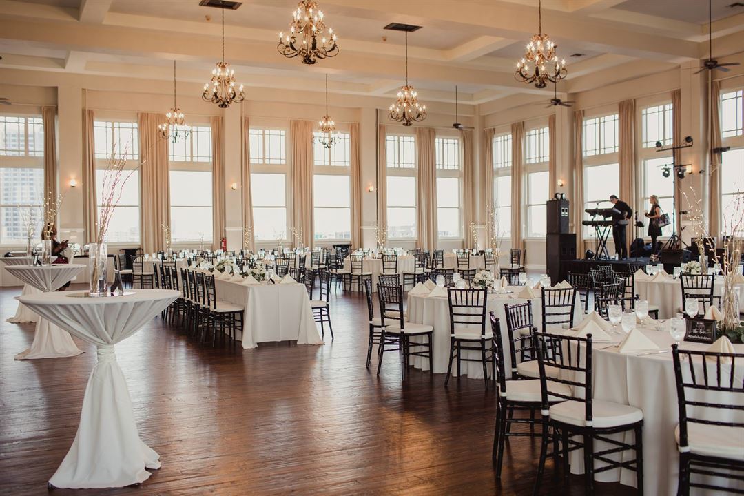 The beautifully restored historic ballroom has natural wood floors, antique chandeliers, and 22-foot ceilings with 15-foot windows on three sides for great views.