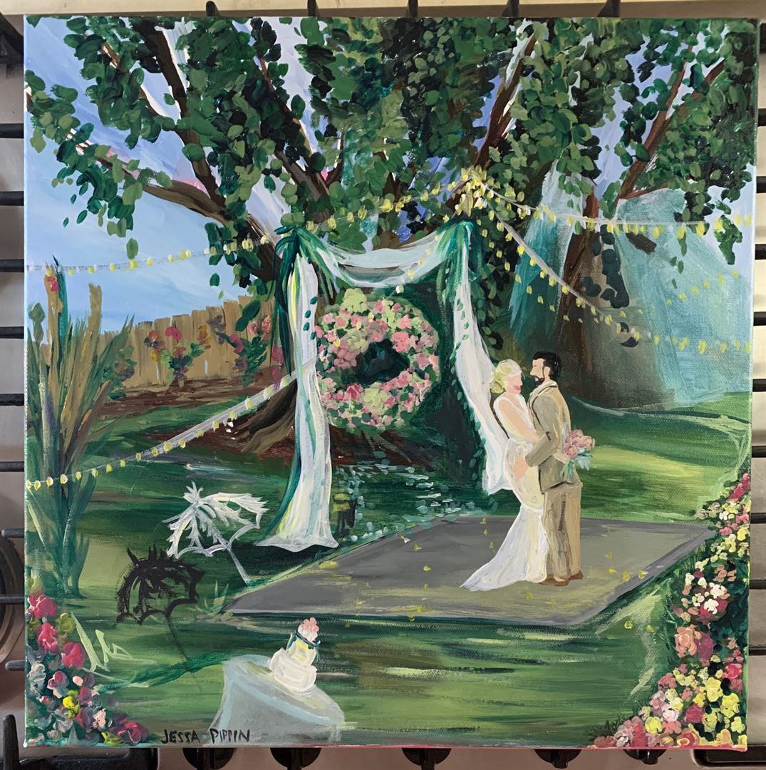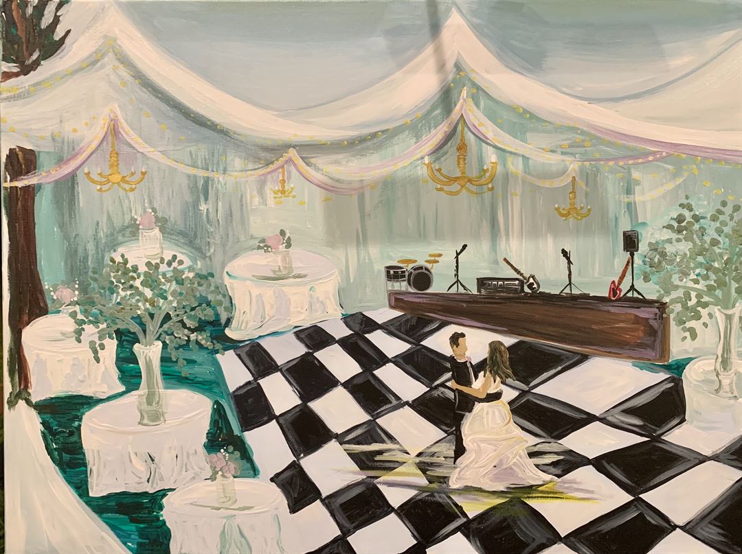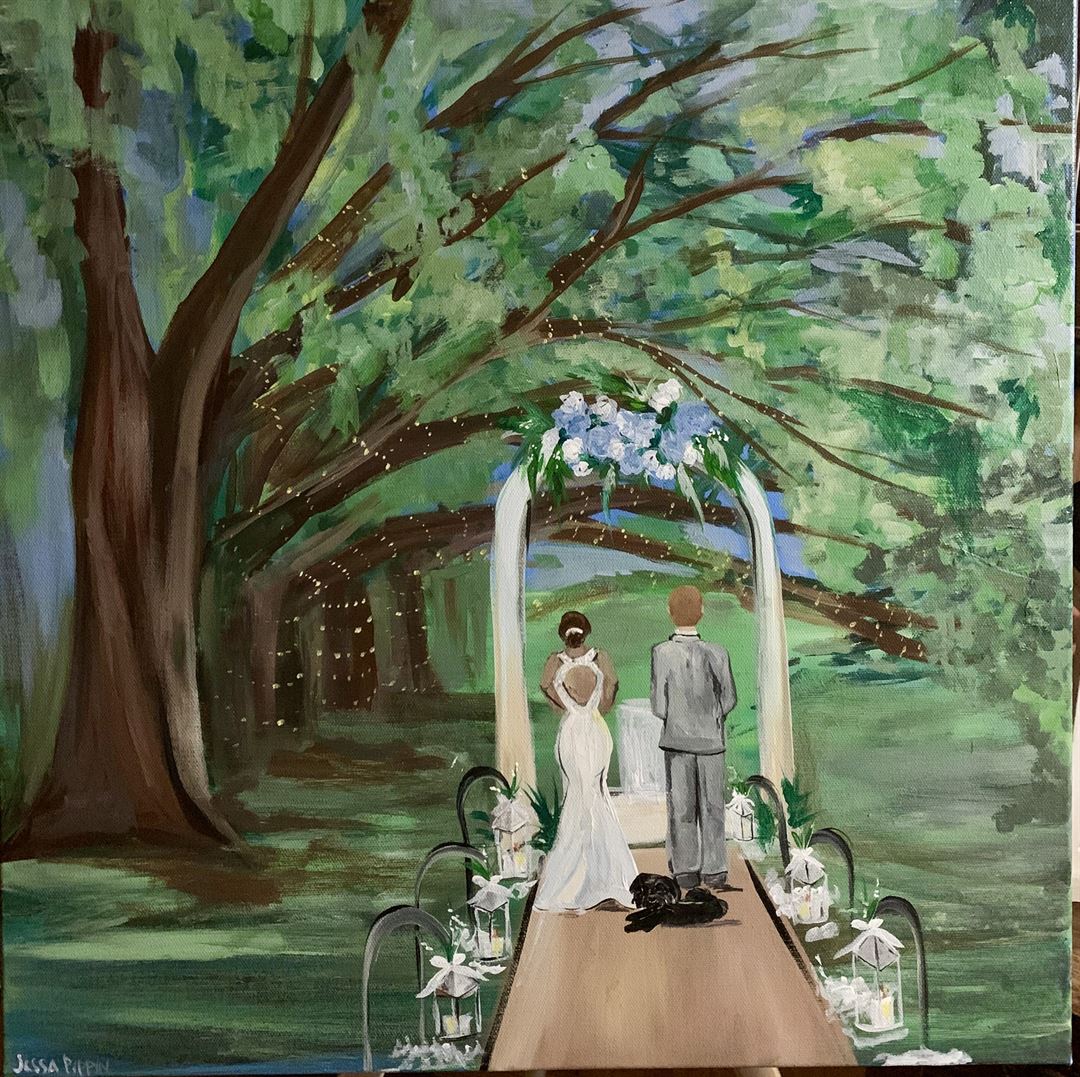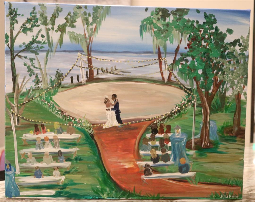 Custom sizing is always welcome, but the most beautiful paintings have been painted on 20x24” gallery quality wrapped cotton canvas. Your masterpiece will be completed within 5 hours. I will arrive two hours before the start of the ceremony and paint throughout the reception as time allows. The painting will be on display for your guests to adore for the last portion of the reception.