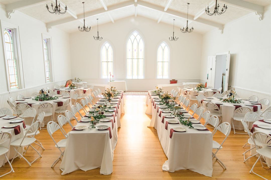 The space is perfect for small intimate gatherings with a capacity of 100, and we also offer a kitchen, outdoor space, and Bridal Suite. Our venue is ideal for showers and luncheons because you can choose your event space based on the size of your party. Utilize the Meeting Room for a more intimate event or Chapel for a larger guest count.