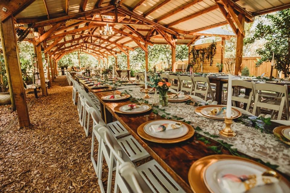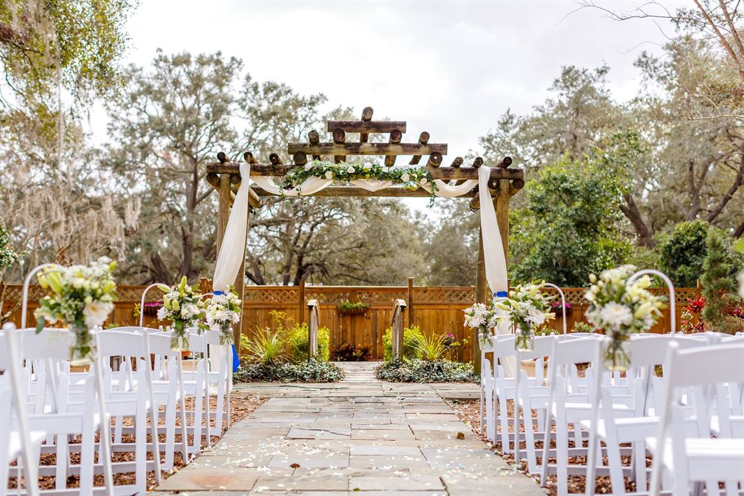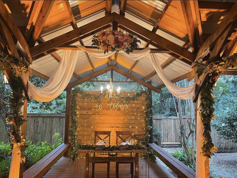 Nestled in a hammock of beautiful oak trees, the seven acre woodland gardens boast a multitude of beautiful locations to capture a lifetime of picture perfect memories. In addition to the picturesque gardens, we have space for both ceremony and reception, including our large mosaic granite dance floor, customizable wedding pergola, and 2400 sq. ft. dining pavilion. As day turns to night Harmony Gardens is transformed into a fairytale kingdom. With its towering trees, artisan made torches lighting the winding pathways, twinkling lights and stars above, an evening filled with romance is sure to be had by all. Our large dining pavilion guarantees the gardens are usable rain or shine.