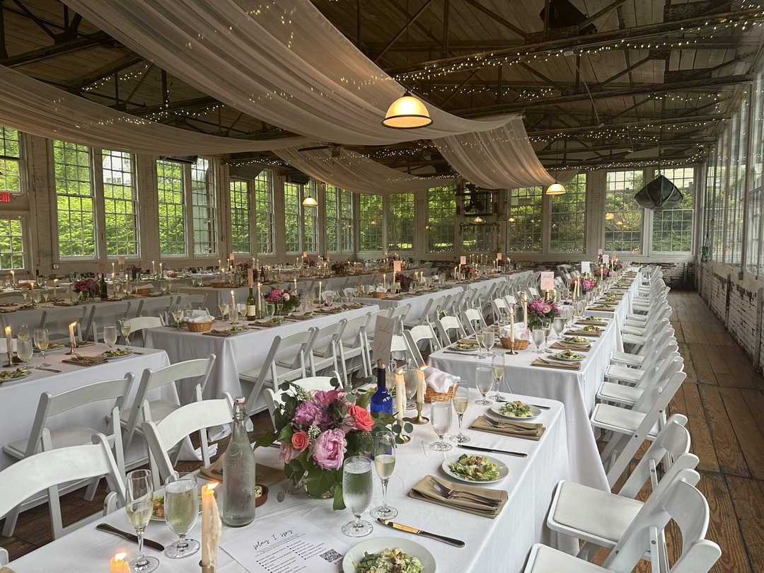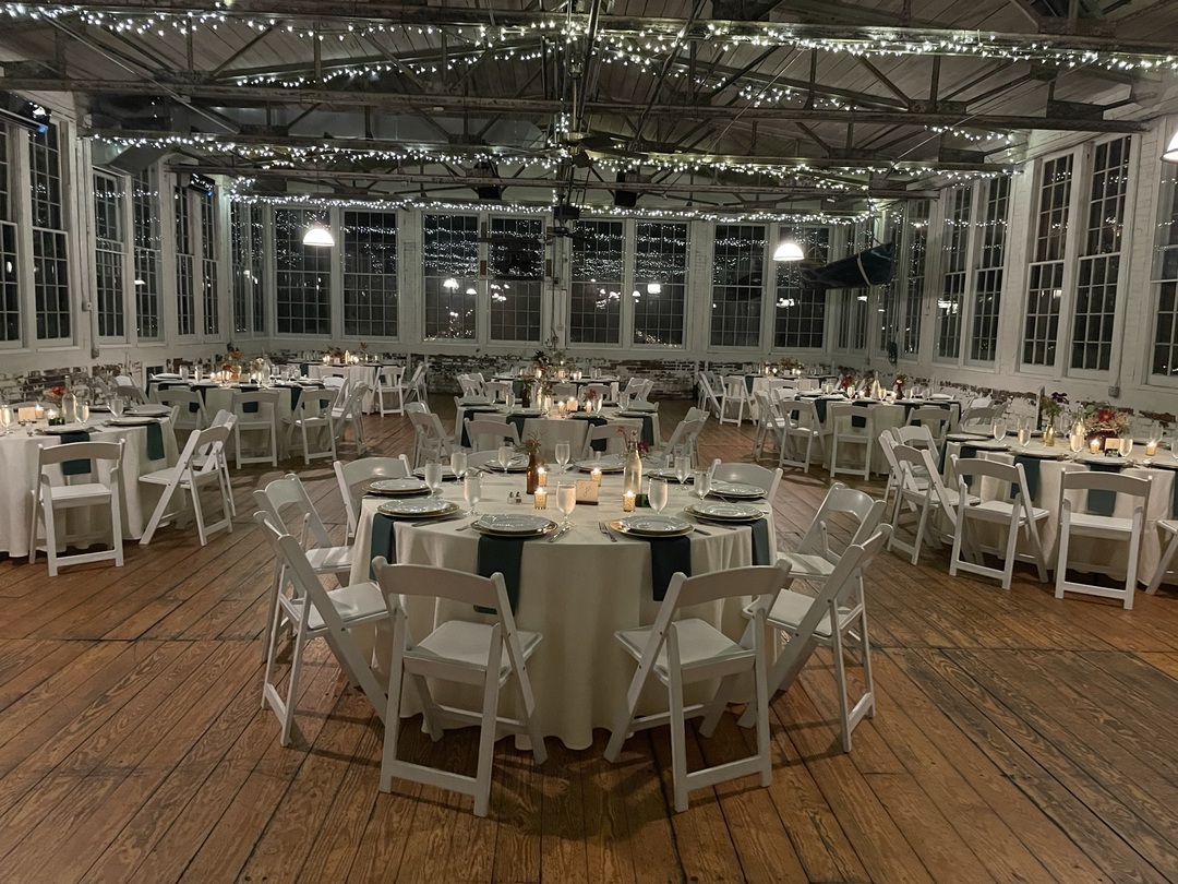 With room for up to 225 guests, The Lace Factory offers spaces that can be transformed from minimalist elegance to statement-making extravagance. The historic entry hallway sets the tone with an urban edge, while the Riverview Room adds a touch of intimacy for rehearsal dinners or brunches. For an unforgettable entrance, couples can even arrive on the Essex Steam Train’s vintage Pullman coach—an industrial-chic flourish that turns the start of the celebration into a show-stopping moment.