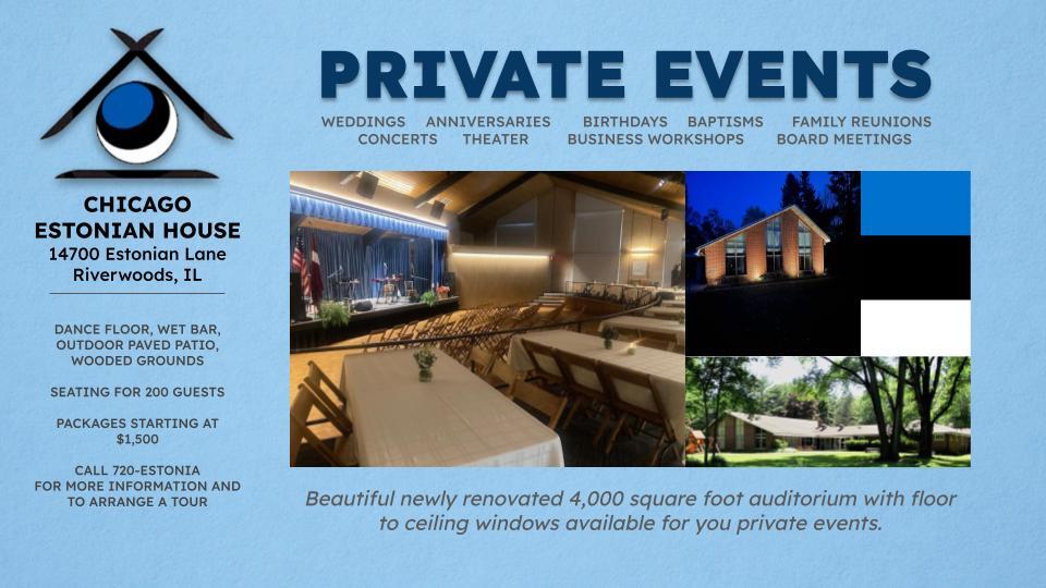 Beautiful newly renovated 4,000 square foot auditorium with floor to ceiling windows available for you private events. Dance floor, we bar, outdoor paved patio, wooded grounds. Seating up to 200 guests Packages starting at $1,500
