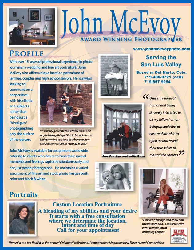 Documentary/Photojournalistic style wedding and portrait photographer available for small weddings and on location portraits.