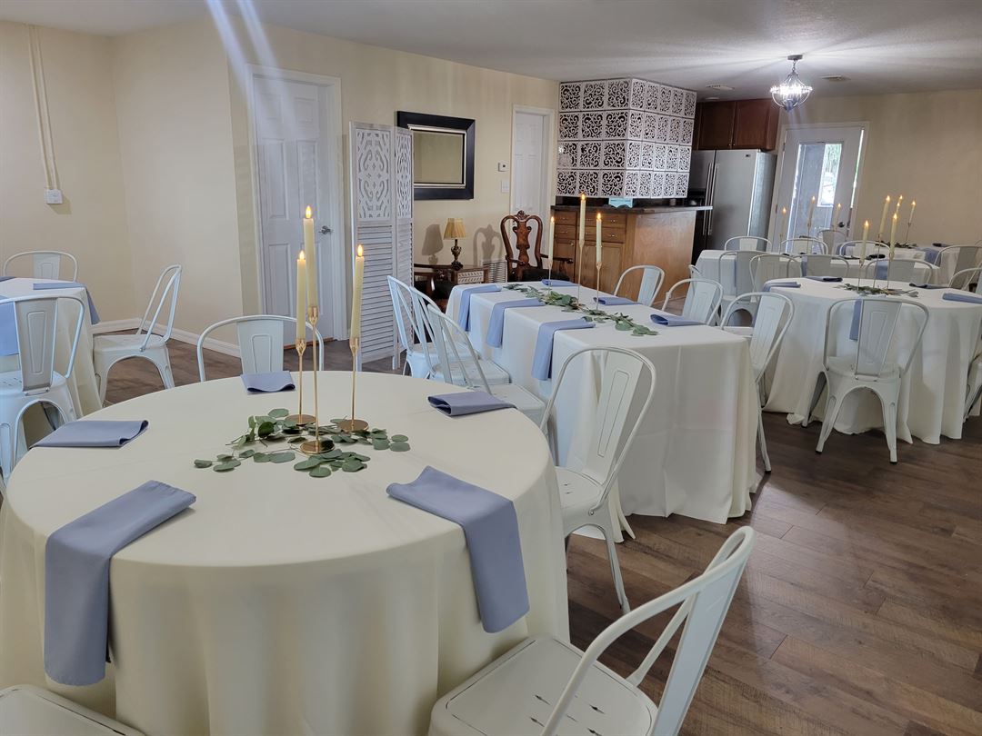 Round tables and banquet tables with chairs are Included. For weddings, use of the outdoor Peninsula is used for the ceremony and The Lake House for reception. Other Events include birthdays, graduation parties, office meetings, social functions, family reunions and more! Guests can book their stay at the resort that is just steps away from The Lake House.
