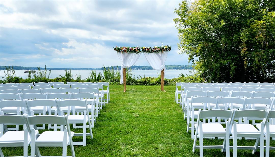 Your wedding ceremony can be held in the location of your choice, either a lakeside or in a more wooded setting. Up to 200 white folding chairs are included.