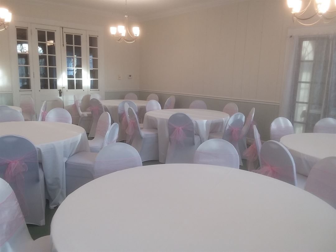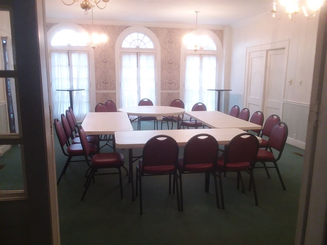 Rental of our first floor includes the use of double parlors, large dining room, relaxing front porch, and rear brick patio. Our dining room seats up to 48 comfortably, but we can accommodate up to 60 guests, standing throughout the facility. Rental includes tables (round & rectangle) and chairs. Tableware including plates, silverware, glasses, serving platters and cookware are available for use at no additional charge.
