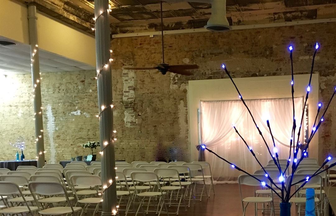 Our ballroom is 2400 square feet, wood floors, historic tin ceiling and columns. There is a utility room with a large triple sink in the backroom however, there's not a kitchen or any appliances on site. We can provide information to obtain such, if needed. There are three working areas, two in the back and one small room inside our venue. There is an alley accessible door for deliveries and cleanup. Also, we have two attached bathrooms however, depending on the venue "allowed" capacity, we are currently using one at this time. Our venue is handicap accessible. We do have a "Open Vendor" policy.