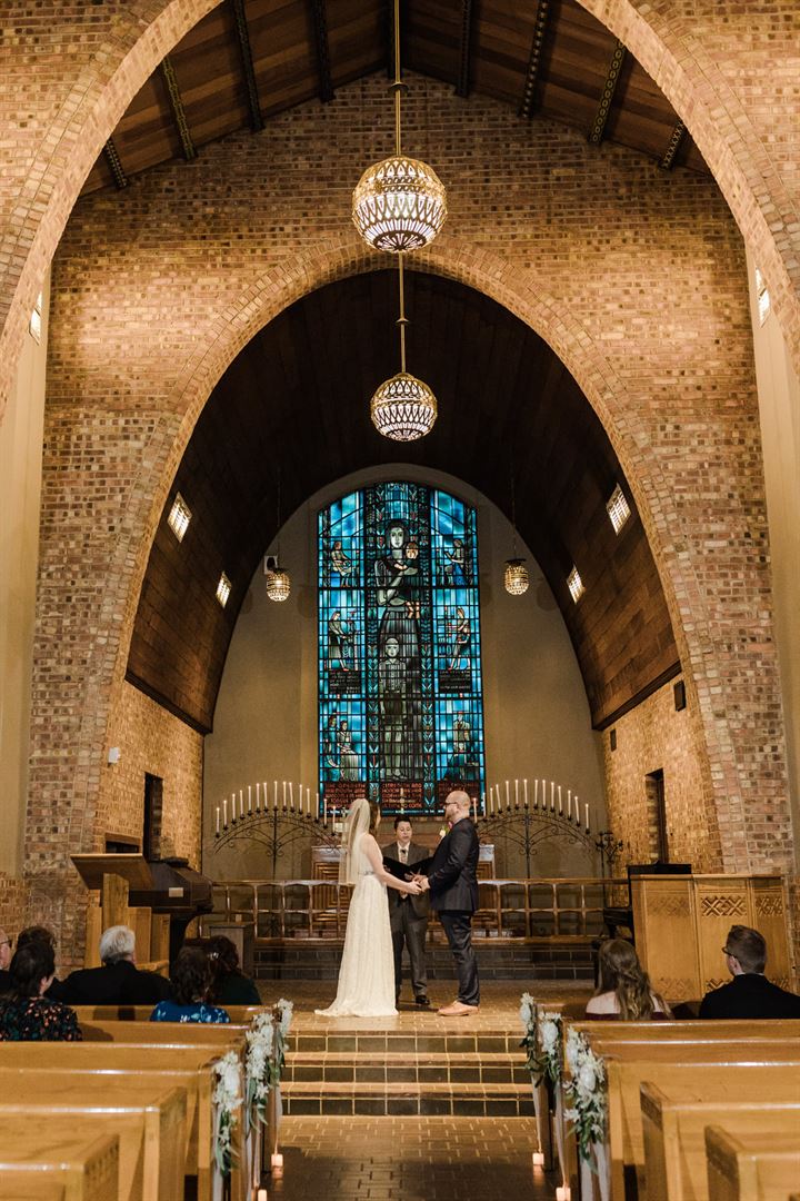 As you walk into the Little Chapel in-the-Woods you are entering into a tradition. Located on the edge of Texas Women’s University, the chapel is a secluded sanctuary that has held weddings since September 1939, a few months before its dedication by Eleanor Roosevelt. The natural beauty that surrounds the Little Chapel is harmonized by the beautiful interior stain glass windows. The Little Chapel in-the-Woods’ rich symbolism carefully portrays “Woman Ministering to Human Needs” on saw-pierced and riveted brass lighting, & woodwork executed in beech, hand carving woodwork on the pews.