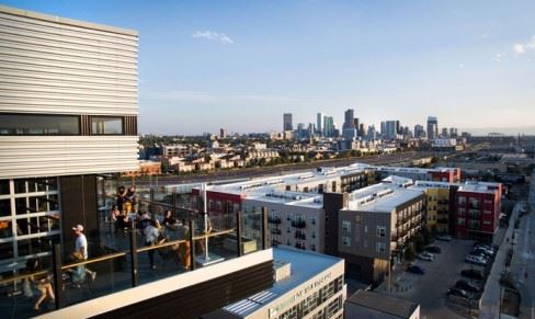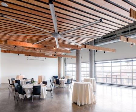 The RiNo Event Hall at The Source Hotel can accommodate 150 attendees for a ceremony or 100 attendees for a ceremony + reception. Light filters into the room through large garage door-style windows, illuminating occasions held within. The view from these glass portals encompasses the Rocky Mountains, providing a picturesque backdrop for any event. Many couples choose to host their ceremony in the ballroom and proceed to The Woods rooftop restaurant for a cocktail hour with a view. This allows the on-site crew to transform the ballroom into an ideal reception space for an evening on the dancefloor. The hotel itself offers 100 rooms for overnight stays. The decor in these rooms is inspired by Scandinavian and Japanese design, giving guests a relaxing space to unwind after a busy and exciting day.