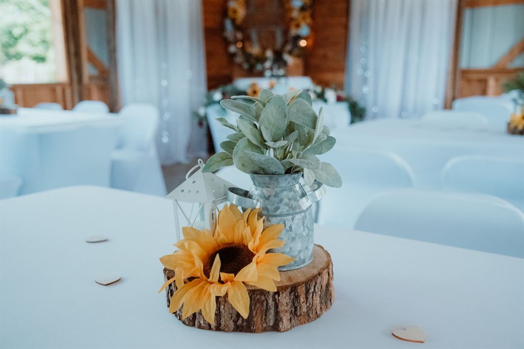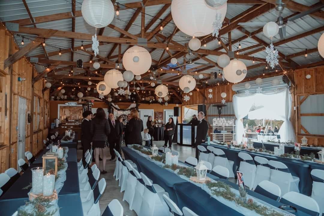 Guest can enjoy their day with pastoral views of grazing black Angus cattle, dancing in the beautifully lite event barn or playing corn toss in the yard. Depending on the season, the sunflow er field is available and adds to the beauty to the ceremony site. Our 30x60 barn is equipped with a prep kitchen and bathrooms for guest. Classic Edison lights and a rustic wood backdrop help create a romantic atmosphere. A separate building, known as The Watering Hole, is located on the backside of the barn. Decorated with antique bottles, lights and baskets, this is a perfect place to set a large BBQ grill near or serve refreshments to your guest. Our bridal cabin, also known as the Sugar shack, has a private bathroom and provides the bride with her own space to prepare the for ceremony/reception.