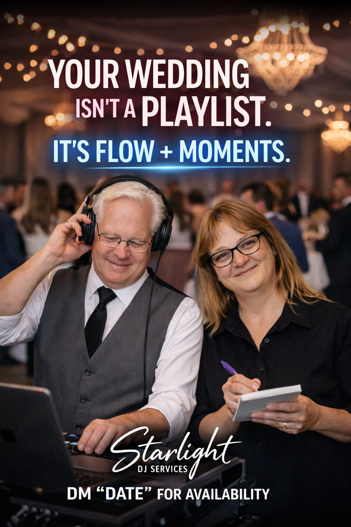 Starlight DJ Services is led by Paul and Jennifer, a husband-and-wife team with decades of music, event planning, and wedding experience. We do much more than play music. We help shape the flow of the evening, support the important moments, and create a celebration that feels smooth, personal, and fun for you and your guests.