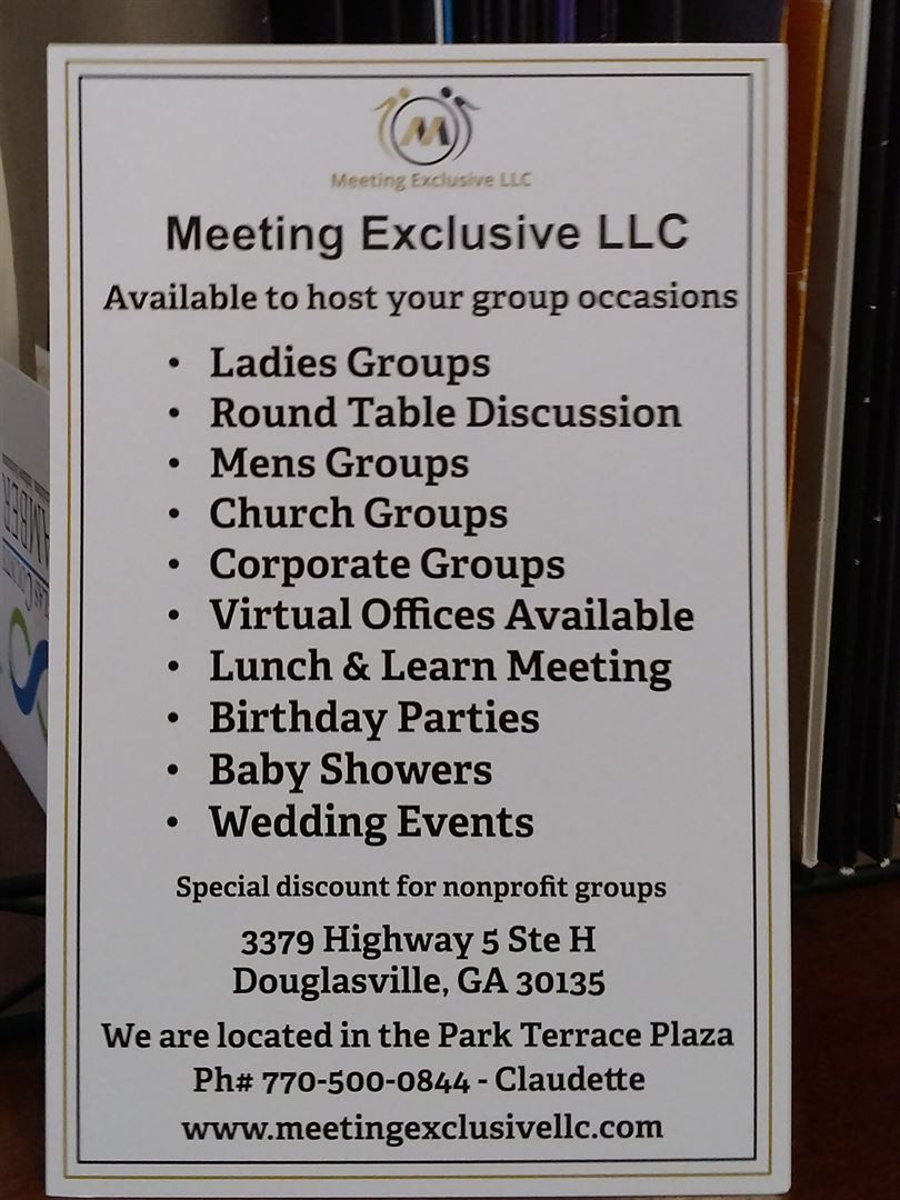 We rented the banquet room at Meetings Exclusive for a Sweet 16 party and we’re very pleased. The place was perfect and clean. Ms. Claudette was so helpful and professional. I would definitely recommend this facility. Sandra Stephens