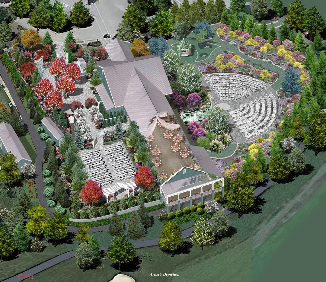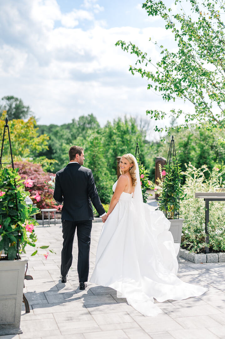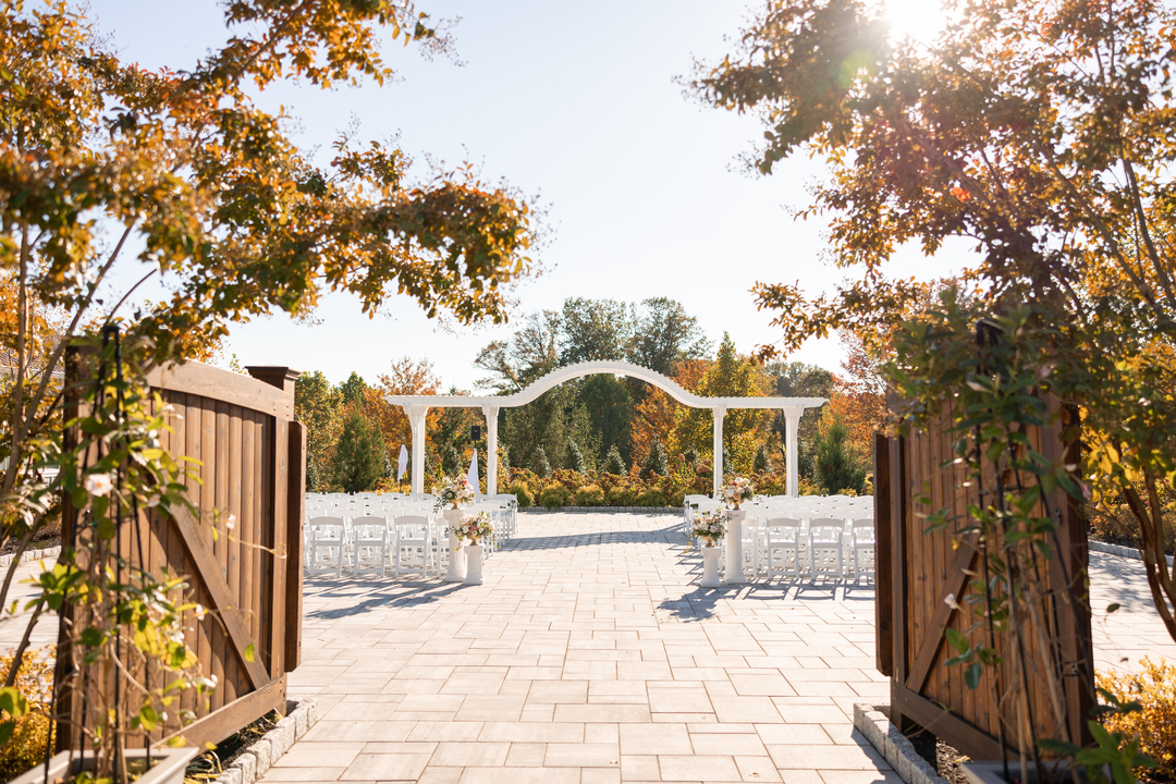 Our venue offers two outdoor ceremony locations to choose from. One features a garden Pergola surrounded by river birches, and the other is a waterfall garden coming in Spring 2026. We also have a beautiful indoor ceremony option in case of inclement weather. Your event will flow throughout our indoor and outdoor spaces with firepits, rocking chairs, two bar areas, elegant uplighting in the ballroom, and glowing tree lights outside that create a magical backdrop for your reception.