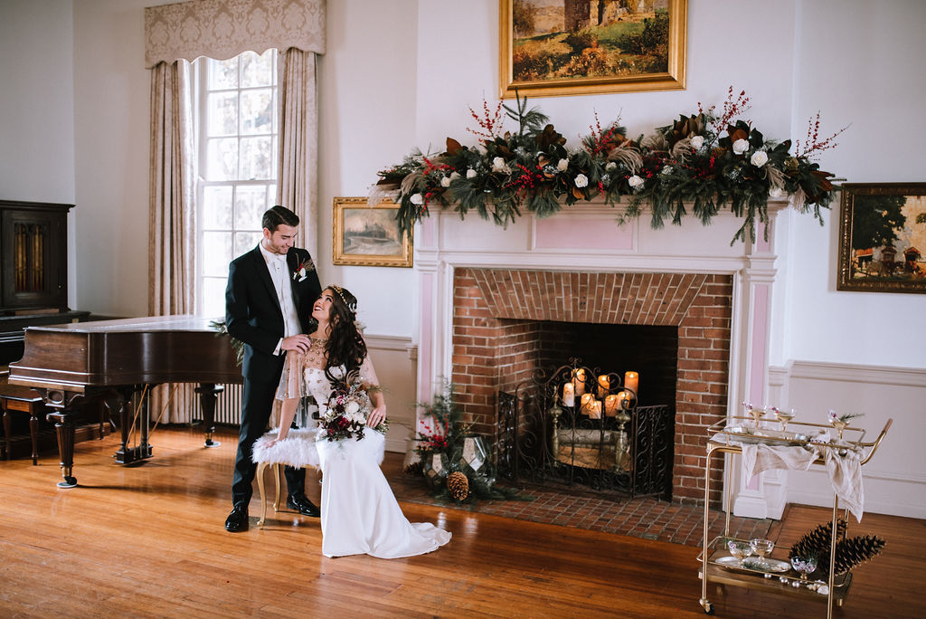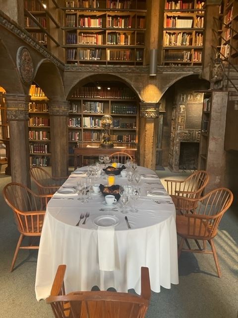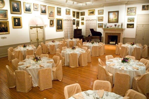 The beautiful Elkins Gallery, a stately Georgian room displaying the museum’s collection of Bucks County paintings, can be booked for intimate gatherings or large groups up to 150 people. A vintage baby grand piano and two fireplaces with mantels flank the intimate space.