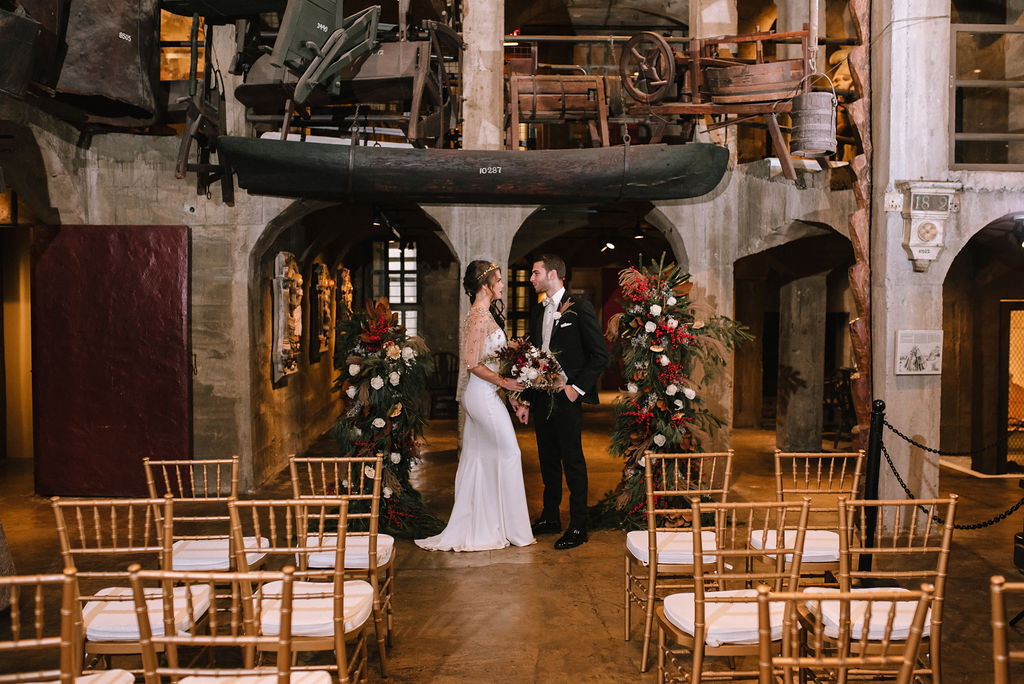 Seasonally, the adjoining Garden Patio Tent is included in your rental, offering a beautiful outdoor garden space for a reception or cocktail party. The beautiful outdoor garden tent can also seat up to 120 guests for dinner. Capacity in the air-conditioned Elkins Gallery, with dancing, is 80 for a unique seated wedding dinner. The combined capacity in the gallery and tent is 150 for dinner with dancing. The Museum’s grounds offer ample space for an al fresco wedding ceremony and unique photo opportunities among the vintage artifacts. Elkins Gallery special event rentals include time for your guests to visit the unusual Mercer Museum Castle in an intimate and personal way.