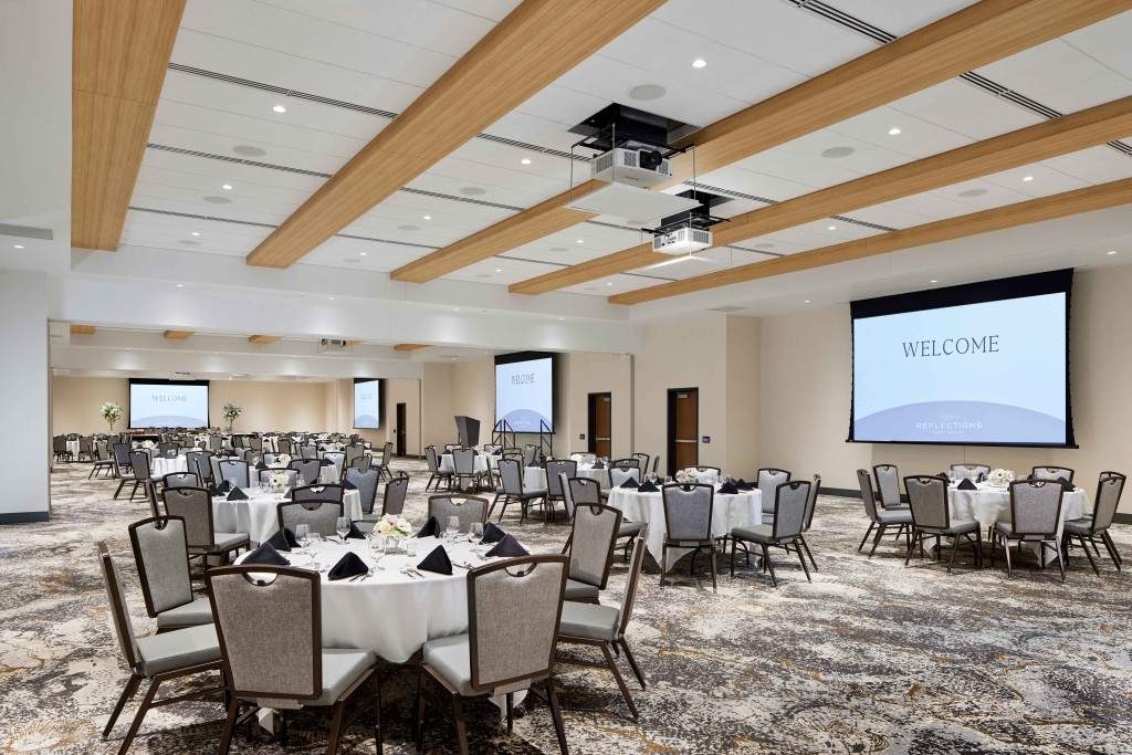 Our newly renovated Reflections event space features over 6,600 square feet of modern elegance with customizable layouts, stylish décor, and natural light—perfect for ceremonies, receptions, and everything in between.