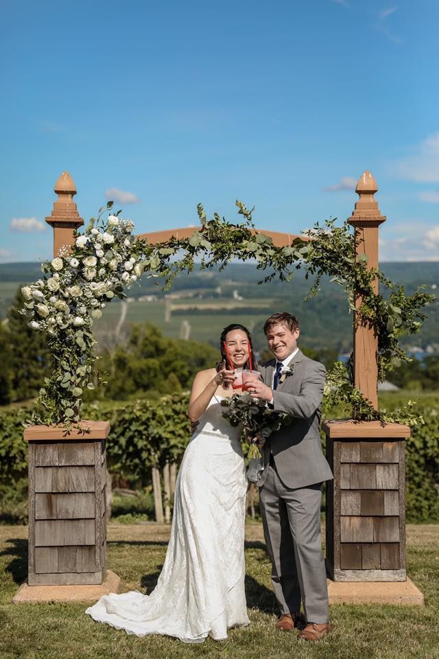 Our beautiful dining room, called the Champagne room, is the perfect setting for a wedding reception. The dining room has 45' ceiling height, a stone fireplace that stretches from floor to ceiling and the room has an entire glass wall that overlooks our vineyards, scenic Seneca Lake and the rolling hillside. The dining room space can accommodate large and small wedding receptions. Adjoining our dining room is a large, open covered terrace for seasonal use, also overlooking Seneca Lake, the vineyards and the rolling hillside. Weddings held here are truly magnificent.