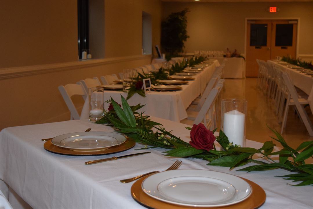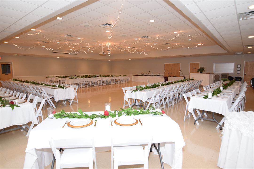 The hall is equipped with a stereo and speakers including an AUX connection for your audio device. The hall also has an overhead projector that can be used to project your images or videos. White table cloths are available to rent.