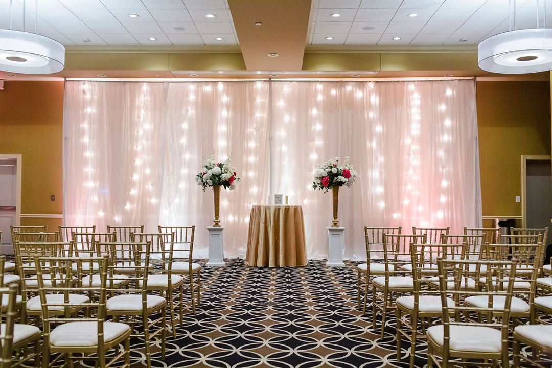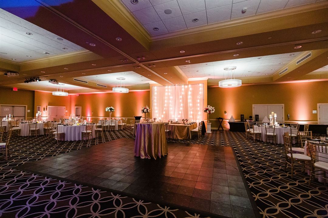 Our spacious ballroom venue allows us to host up to 350 guests in a banquet-style layout. We have an open floor plan and a neutral color palette that allows wedding couples to style the room to their own liking.