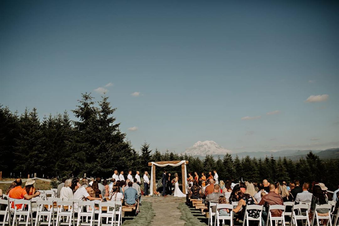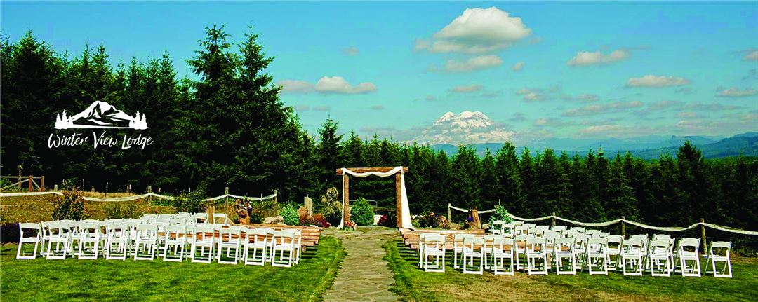 Winter View Lodge sits on a 20-acre property in rural Eatonville, Wash. about 45 minutes south of Tacoma. The view from the outdoor wedding ceremony/reception area of the lodge features the majestic Mt. Rainier, the valley below, and endless groves of evergreen trees. Rentals can span Friday afternoon to Sunday early afternoon or take place on Saturday only. The interior of the lodge is available to the wedding party for a rehearsal dinner and preparations and features a bridal suite and groom's den, bot with private bathrooms and two guest room spaces. The property also has five dry camping spaces for RVs/trailers for out of town guests or those staying overnight with the weekend rental. We even have some farm animals that like to make appearances! Please check out our website for all the details!