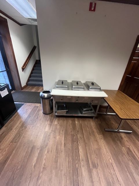 Dining space, that comes with a kitchen and serving area, along with tables and chairs that is the perfect setting for reoccurring meetings, reunions, or host your next birthday, retirement or engagement party.