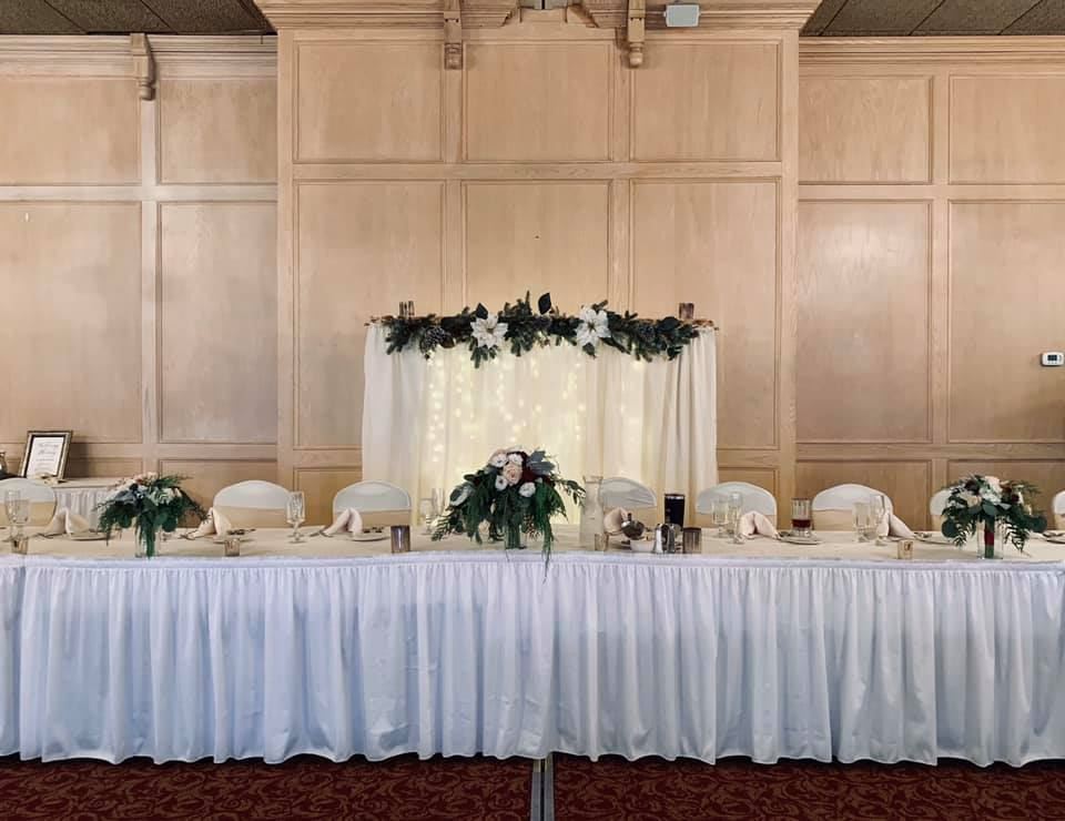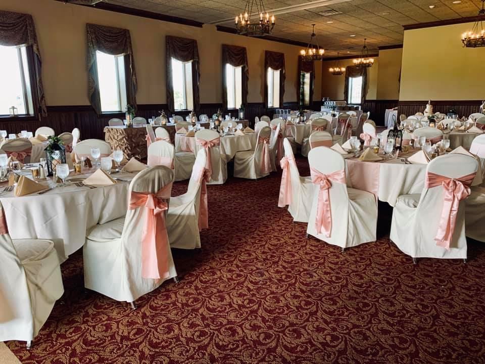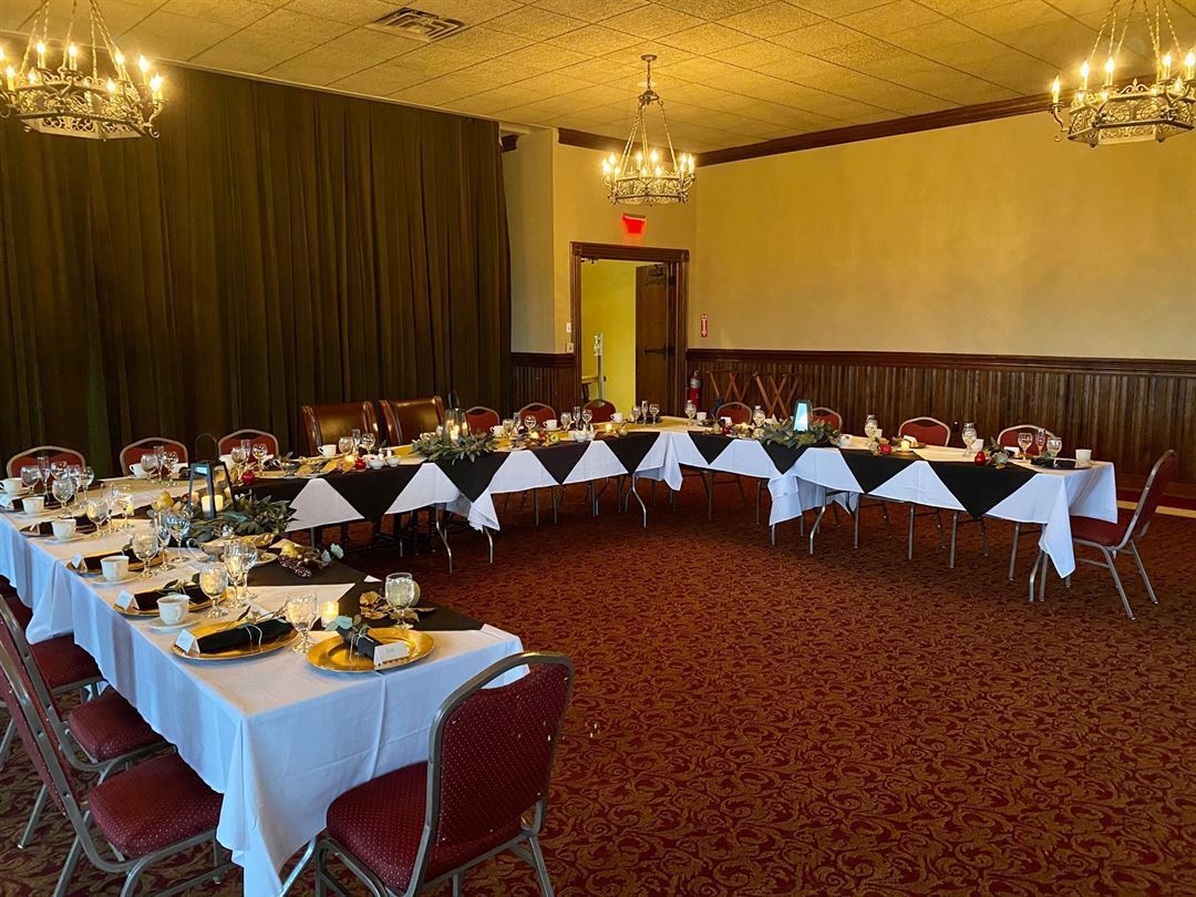 A balcony overlooking the picturesque Olde Stonewall Golf Club provides a beautiful backdrop for a wedding ceremony, while the medieval suites of armor, swords, shields and battle ornaments add to the ambiance. The Grand hall has a seating capacity of 250 and features magnificent bronze chandeliers; the Windsor Room has a warm dark wood with a seating capacity of 100. The turret of the Windsor Room provides an incredible view of the entire golf course.