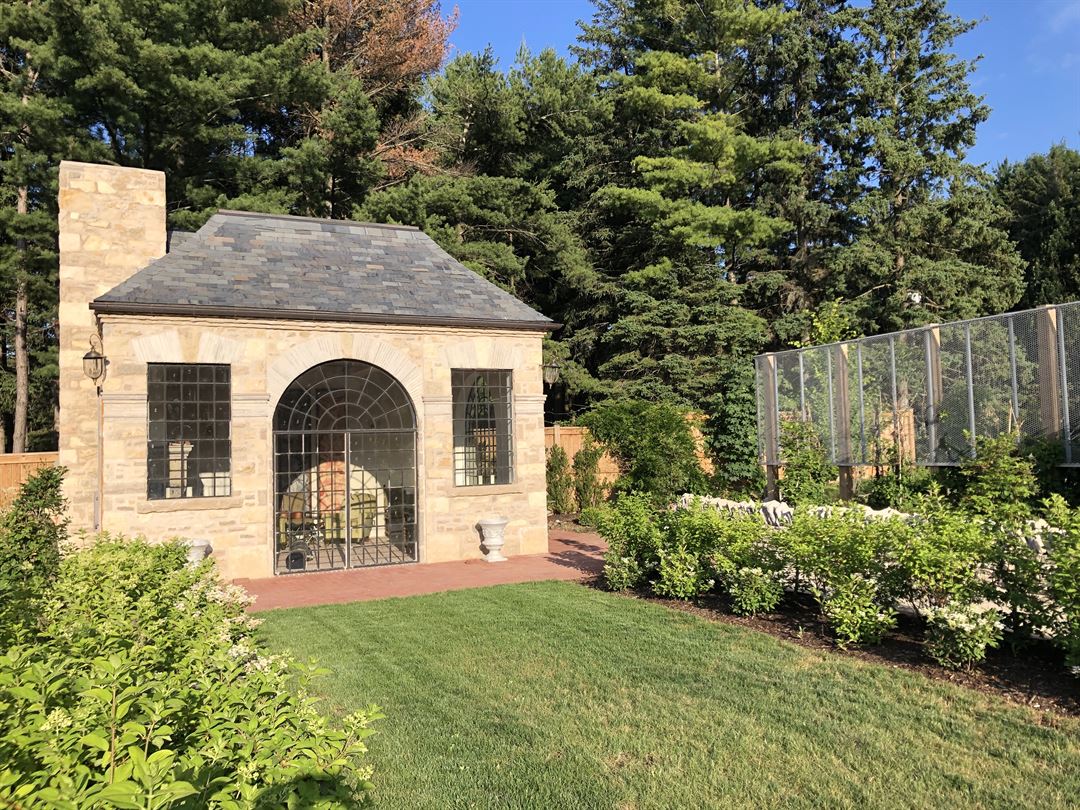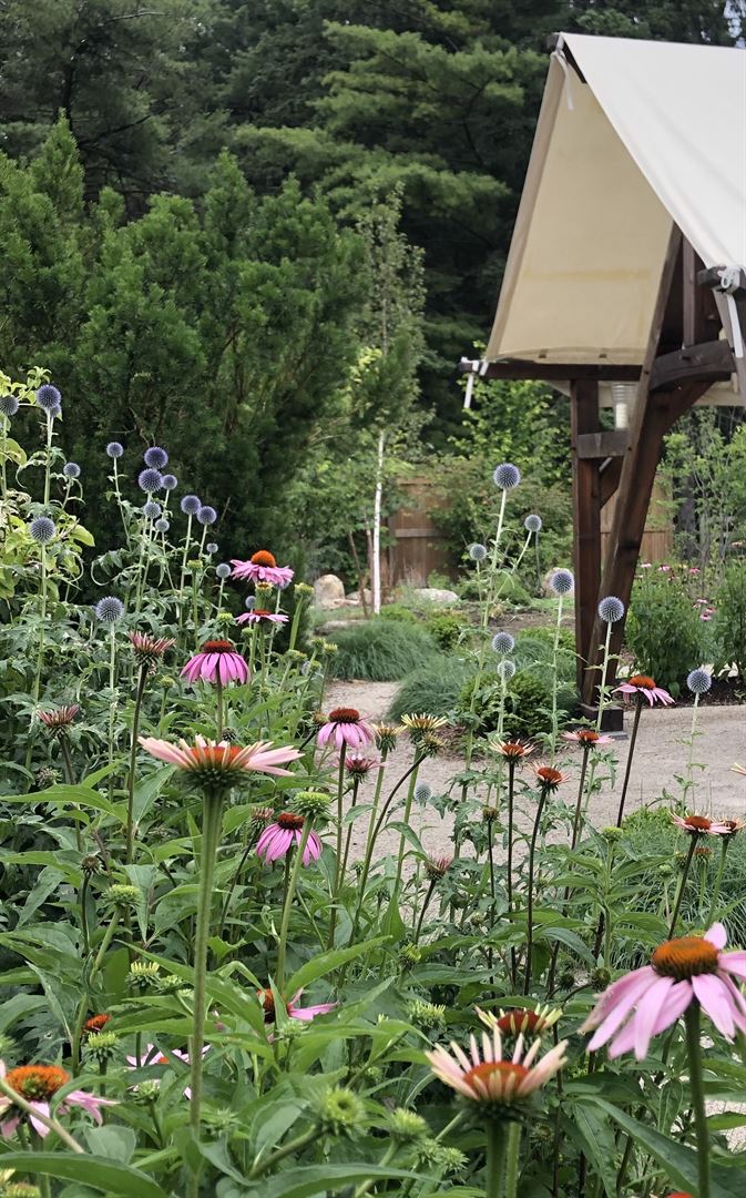 Garden with Pavilion, Dining Tent and Cruck Marquee Event Tent. The pavilion is designed to provide authentic old world charm using natural stone, lime plaster, wood beamed 11 foot ceiling and hand worked slate roofing. The Palladian windows are made of cold rolled steel with truly divided glass panes. The standing wood fireplaces has a hand carved stone mantel. Built-into the external side of the building is a stone bread/pizza oven. The garden is professionally designed and lovingly tended. Pathways meander through the 1/2 acre garden which is being expanded to the remaining 1 acre. Stone walls and steps lead to a dining tent. This space is ideal for engagement or wedding photos. In the future, we hope to have all the necessary facilities to host medium to large events - look for our updates in the Fall of 2023!