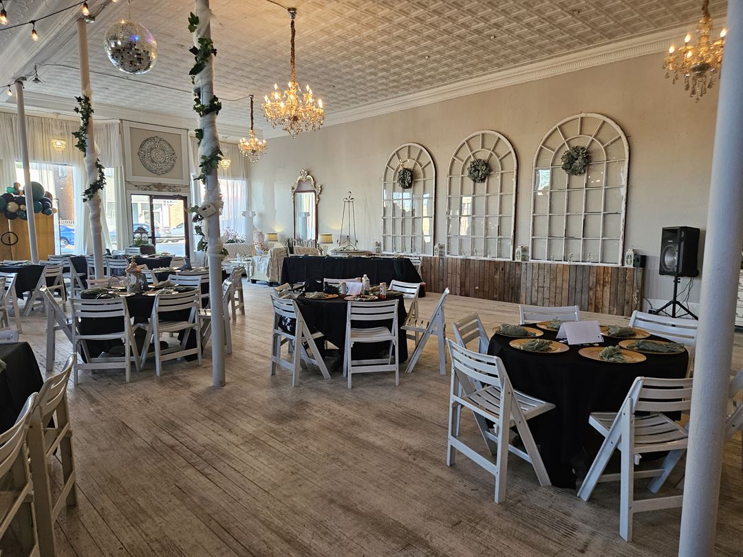 Originally used as a general store, our location has gone through several makeovers before being restored to its former glory. Beautifully bright white tin ceilings, exposed brick, vintage chandeliers, and a bar are all there to add subtle elegance to your event.