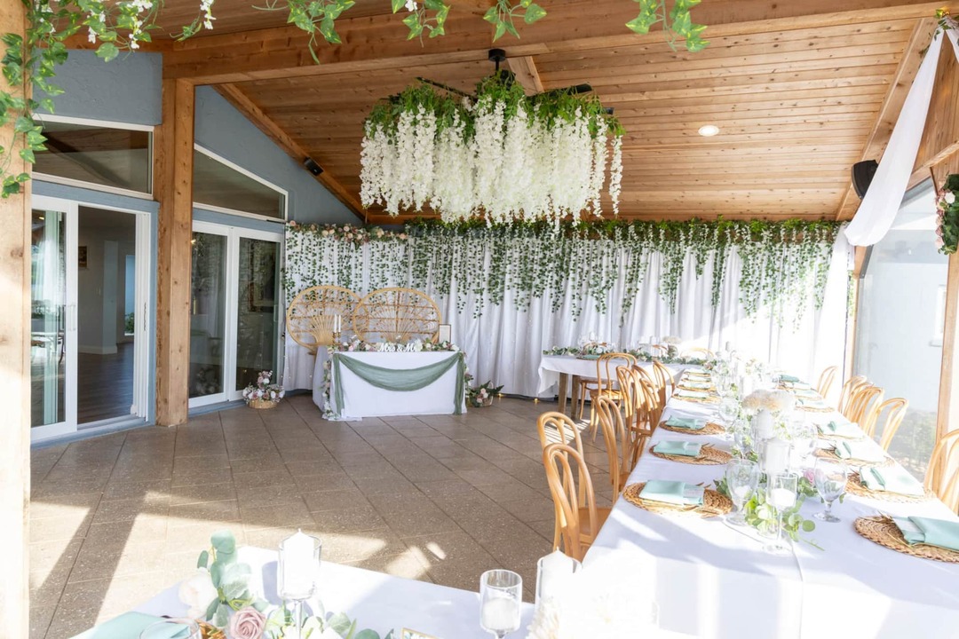 The outdoor space is perfect for dining, dancing, and celebrating under the stars. For added convenience, we offer wedding planning assistance and optional rental accessories, including a decorated altar, sweetheart table, cake table, poolside tables, and coordinated aisle florals (see our Wedding Accessories tab for details).