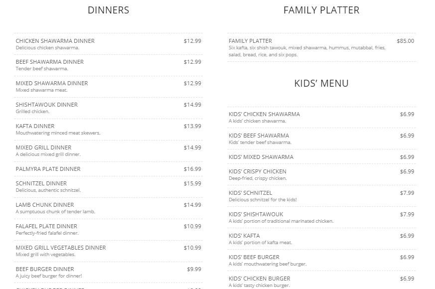 "Palmyra is a family run restaurant that offers its guests a warm and comfortable atmosphere where you can simply enjoy the friendly service and the company of your friends while indulging in delicious, fresh and authentic mediterranean cuisine.