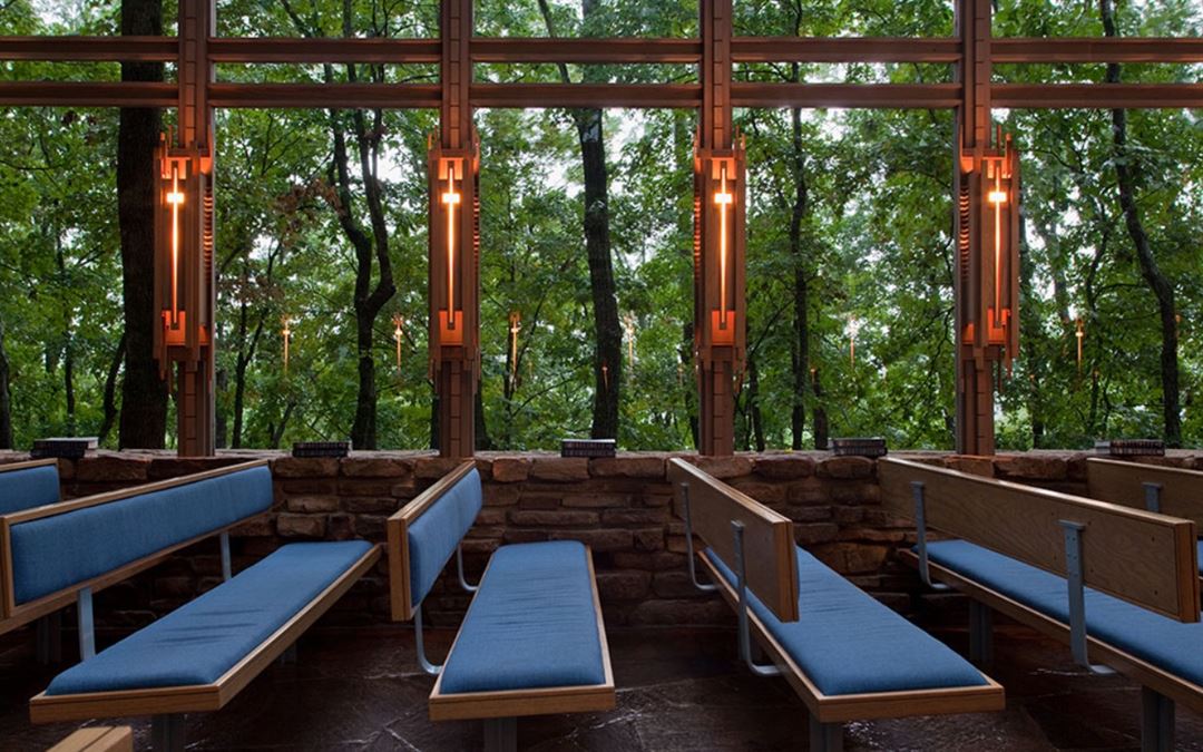 Nestled in a woodland setting, Thorncrown Chapel rises forty-eight feet into the Ozark sky. This magnificent wooden structure contains 425 windows and over 6,000 square feet of glass. It sits atop over 100 tons of native stone and colored flagstone, making it blend perfectly with its setting. The chapel's simple design and majestic beauty combine to make it what critics have called "one of the finest religious spaces of modern times."