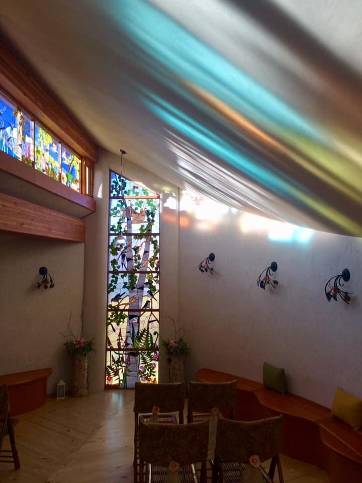 An artistic building in Fairbanks, Alaska for small events such as small weddings, memorial services, meditation classes, reading groups, recitals, vernissages, or other small gatherings. The chapel, that can seat up to 30 people, is meant for people to be inspired and to find peace and magic in special moments of life.