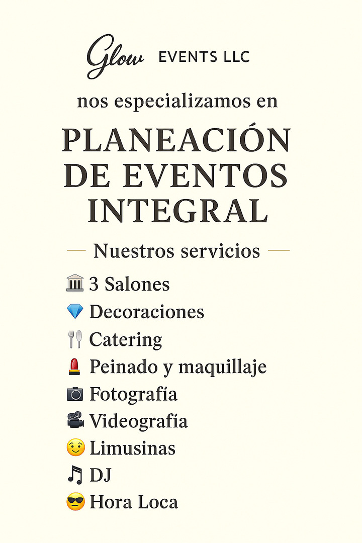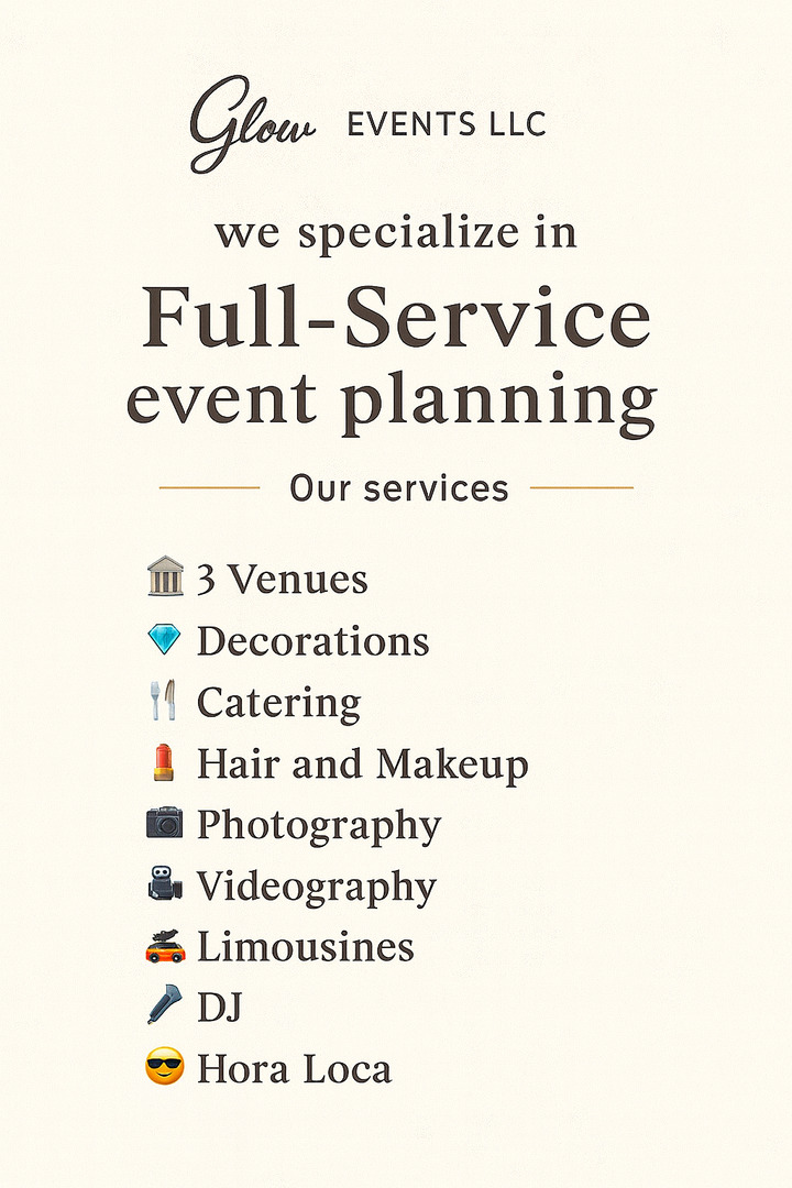Welcome to Glow Events LLC, where we turn your special moments into unforgettable memories. We specialize in Full-Service Event Planning that combines creativity, elegance, and attention to every detail — so you can relax and enjoy your celebration while we bring your vision to life.