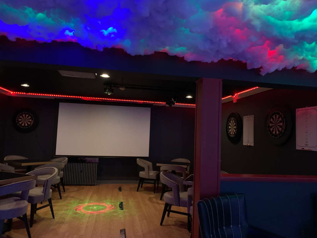 The upstairs floor offers dart boards, a dance area, a large screen projector, tables and bar-side seating. In addition, the upstairs has a special effects cloud and lightening style ceiling to make your events extra cool and memorable!