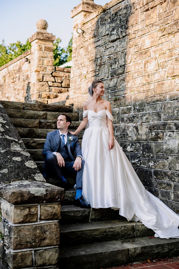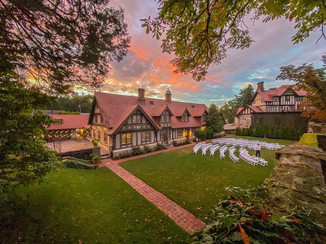 Your wedding will have the elegance of a by-gone era. The character of our venue is displayed with a terracotta roof and verdigris copper accents that are trademarks of the Tudor Revival Style architecture. Your Wedding can be held inside the Carriage House with up to 120-144 guests or, seasonally, under the high peak tent placed in the garden for up to 300 guests.