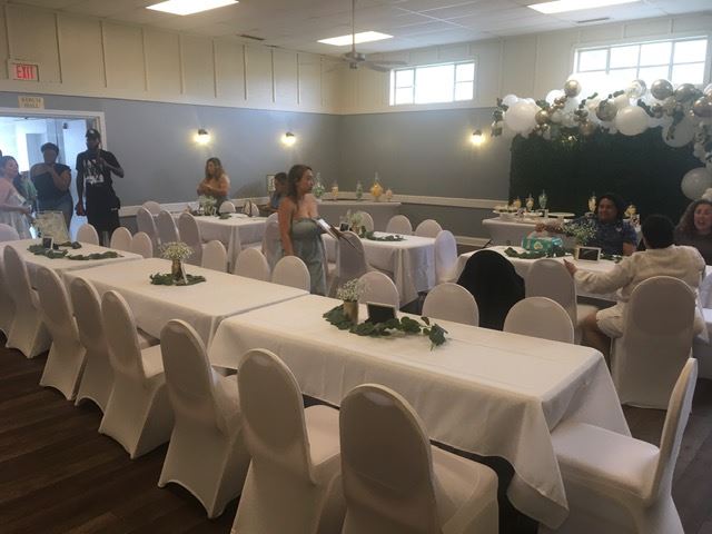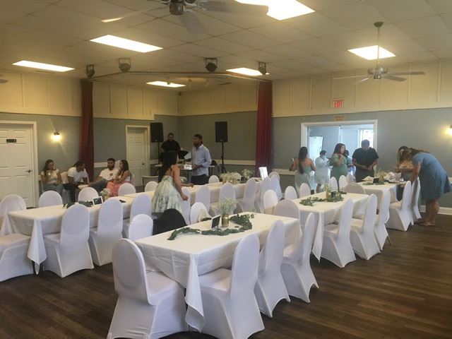 The rental includes use of our (15) 6' tables, (90) chairs, kitchenette, restrooms, utilities, and parking. We also have a 75" smart tv with wi-fi connection available. We do not provide food, linen, service-ware, food storage, decorations, or beverage service. Food may be self-prepared (offsite) and served, or catered. If interested, alcohol may be self-served through a temporary ABC banquet license. ($55-VA ABC). during normal operating hours.