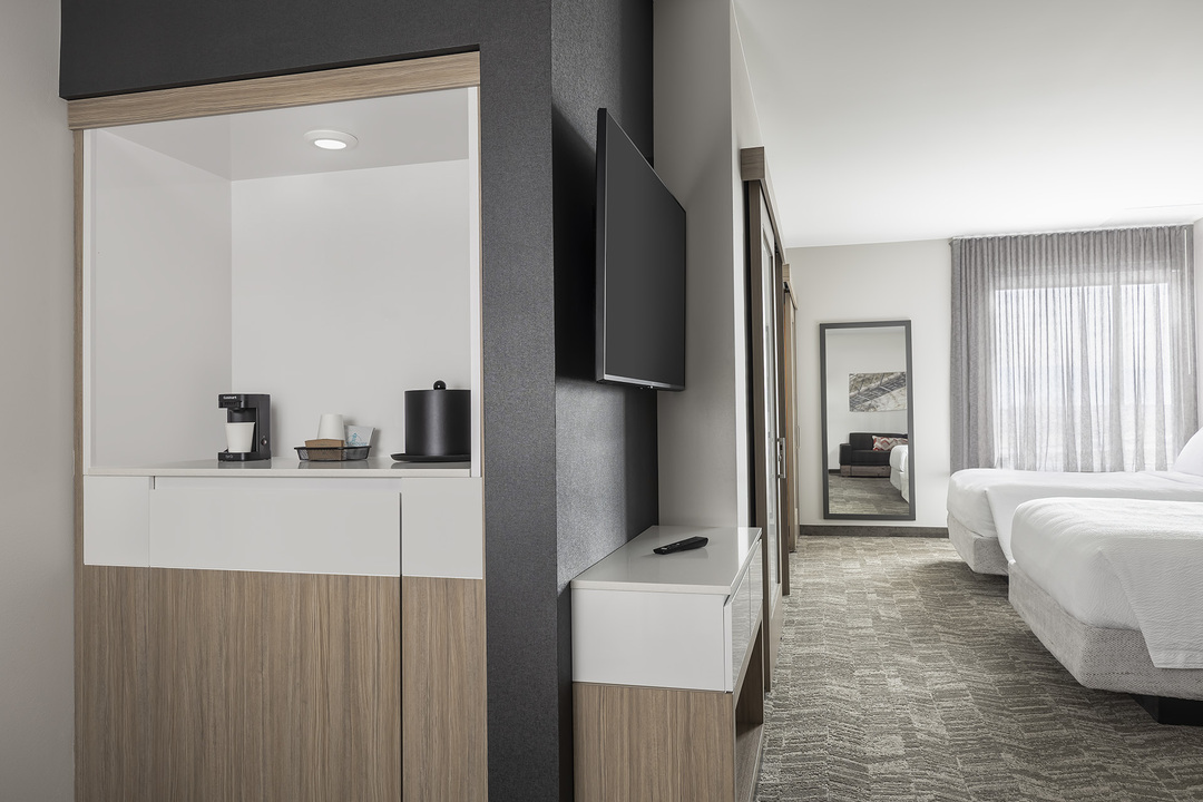 Fargo's newest hotel located in the entertainment district next to Suite Shots Golf, Slick City Action Park and Kingpinz Social. Pool with waterslide, kiddie pool with slide and rain feature, large hot tub. Extra large outdoor patio with views of Suite Shots golf. All rooms are extra-large studio suites and offer a West Elm 3-in-1 (Sofa + Twin Daybed + Twin Trundle Bed). Kings sleep 4; QQ's sleep 6