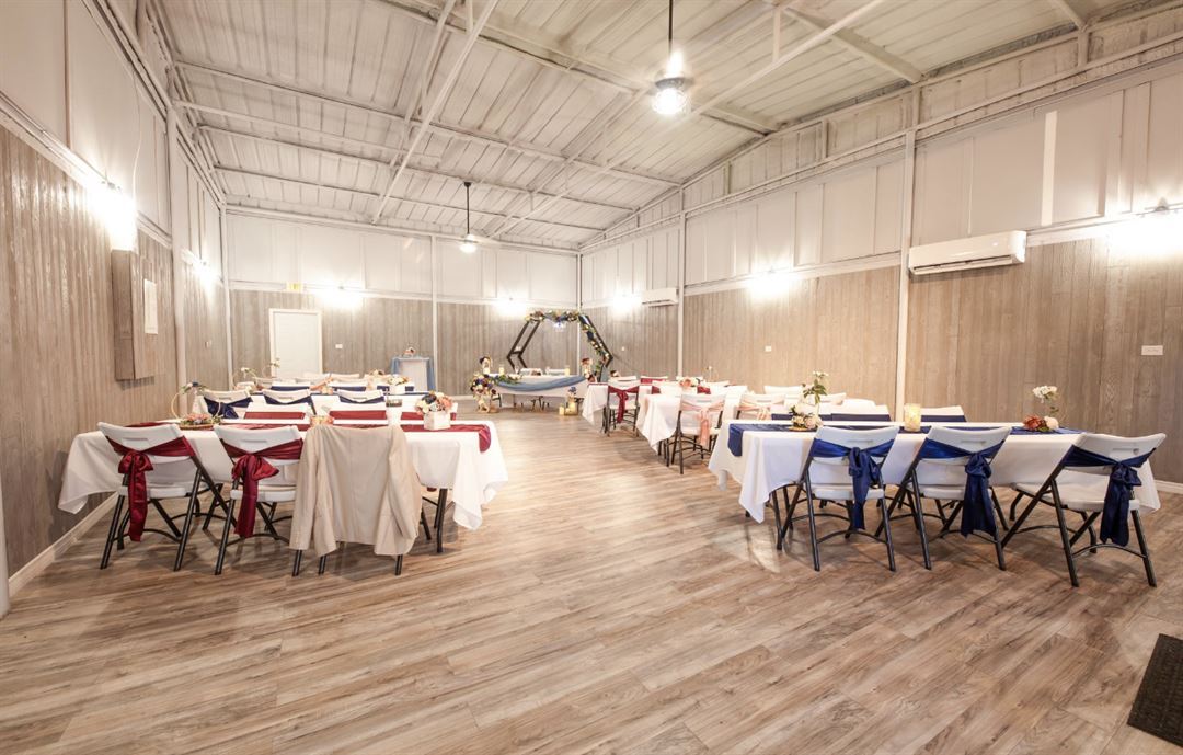 We have a spacious green lawn for your special occasion. White arbor that can be decorated to your liking or by us. 20 X 12 gazebo in concrete. Also, many options to decorate and make perfect for any event. 3,166 sq. ft. indoor building with a refrigerator for your convenience. Tables, chairs, and canopies.