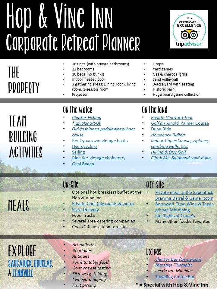 Whether it's a family reunion, corporate retreat, marriage retreat, craft retreat, or wedding lodging, we are your large group venue with lodging in Western Michigan. Guests rave about our indoor pool & large common spaces for hanging out, but they also tell us that what sets the Hop & Vine Inn apart is having 18 individual rooms (with their own bathrooms!) to ensure everyone has a place to call their own during their large group gathering. Our variety of room types ensures everyone has the perfect size room to stash their suitcases, let a kiddo grab a nap, get ready in their own private space, or simply relax in their own personal area.
