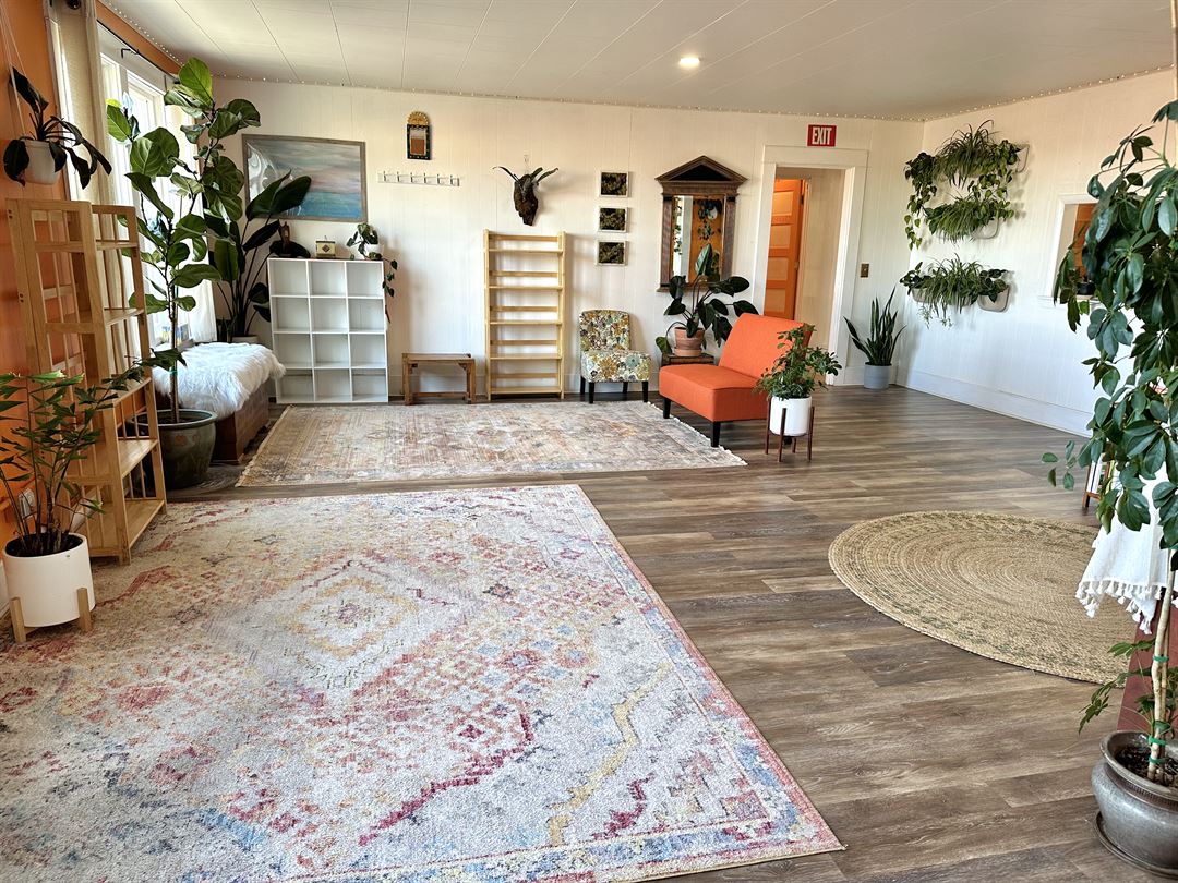 This studio space is a renovated historic second-floor portion of a well-loved downtown building. There is an eclectic mix of bars, restaurants, shopping, and parks all within walking distance. The entire space is available for rent, you will have access to both entrances and exits and all amenities. Amenities include free high-speed Wi-Fi, a surround sound speaker system, heating, cooling, access to the small main studio stage, all aesthetic assets (fairy lights, etc.), use of whatever chairs and tables we have in storage, as well as your own storage closet during rental hours. The entire space is decorated with real tropical plants, making the upstairs studio feel like a luxury boho loft or treehouse.