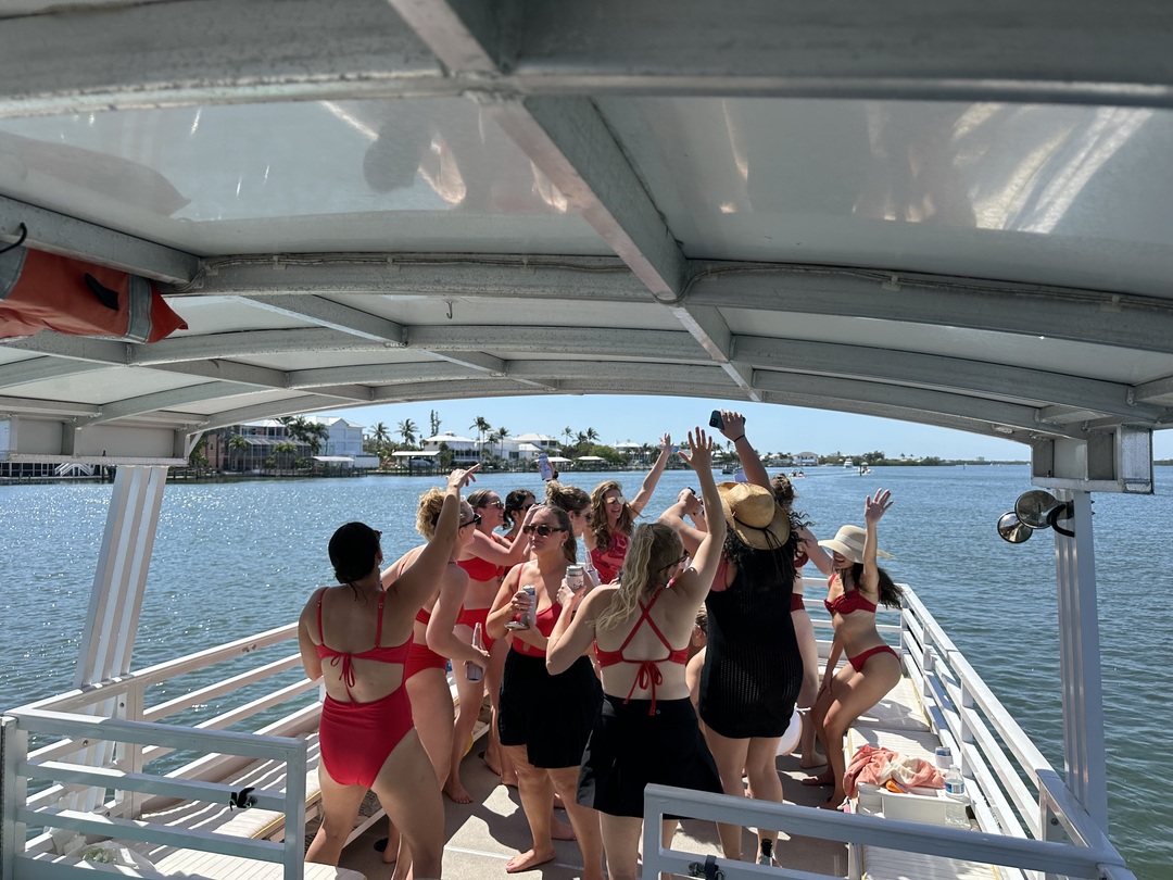 We are the best place to have your bachelorette party on a boat in Fort Myers Beach Florida. Our boat is a large party pontoon that can accommodate up to 20 people. We specialize in private tours for your special day. Make your bachelorette party a memory that will last a lifetime for you and everyone else you invite. We have an onboard bathroom, kicking stereo, thats bluetooth ready for your playlist, and plenty of room to move around and even dance.