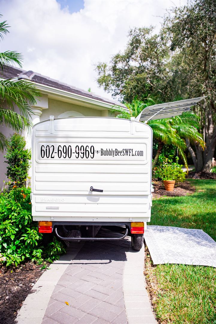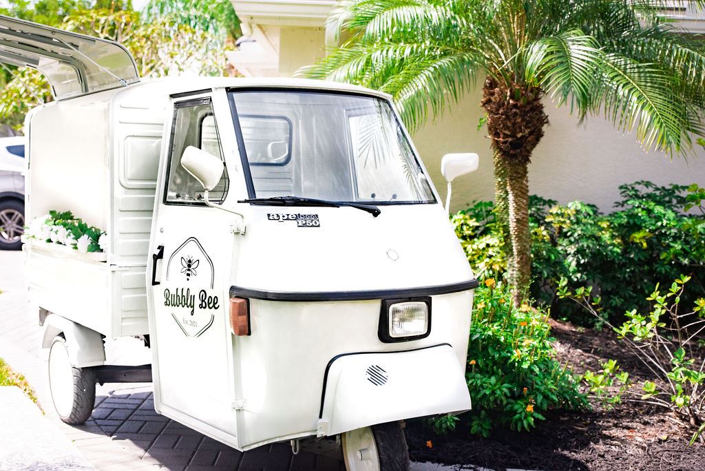 The Bubbly Bee is a vintage Italian Piaggio "Ape" (pronounced "ah-pay" in Italian which translates to "honey bee" in English) transformed into a miniature mobile bar.