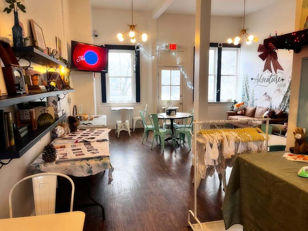 Nestled in the heart of Fort Thomas, Kentucky, this cute little mom-and-pop ice cream and coffee shop is bound to warm your heart! The exposed brick walls, industrial-high ceilings, and warm Edison bulbs create a cozy, stylish atmosphere. Mid-century modern touches and eclectic accents fill the space, making it feel classy yet family-friendly and welcoming. Housed in a building that nods to Fort Thomas’ rich history, the shop blends small-town charm with modern design. Two rooms offer flexible layouts — bright, open areas for activities and celebration, with cozy corners for quieter, more intimate moments or special toasts and speeches.