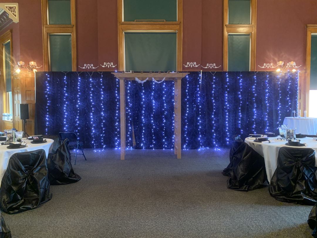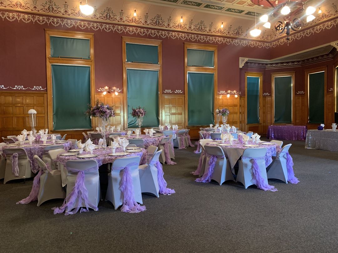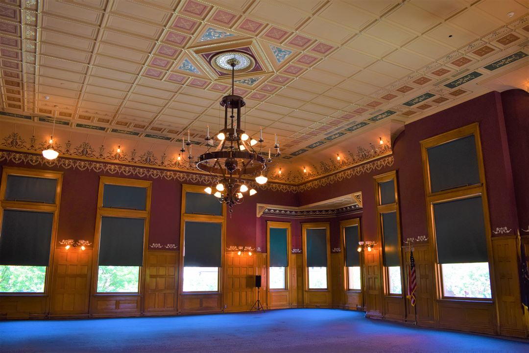 City Council Chambers and Courtroom. An extensive 2009 architectural renovation has restored its early 20th century Victorian beauty. Oak paneling, rich colors and 24kt gold—leaf stencils highlight the ornate 22-foottin ceiling and expansive city views. Your guests may ascend the impressive Grand Staircase to the second floor entrance or use the convenient elevator. The Shields Room has a banquet seating capacity of 150 guests and 200 guests for stand-up receptions or lectures. Two smaller rooms, the Sue Ann Slane Rotating Gallery and Board Room, can accommodate 30-50 people, respectively.